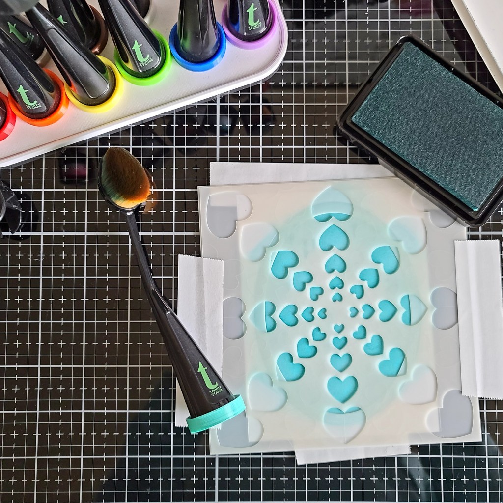 I removed that stencil and lined up the next smallest oval along with the first layer of the heartburst stencils and inked up a darker teal ink.