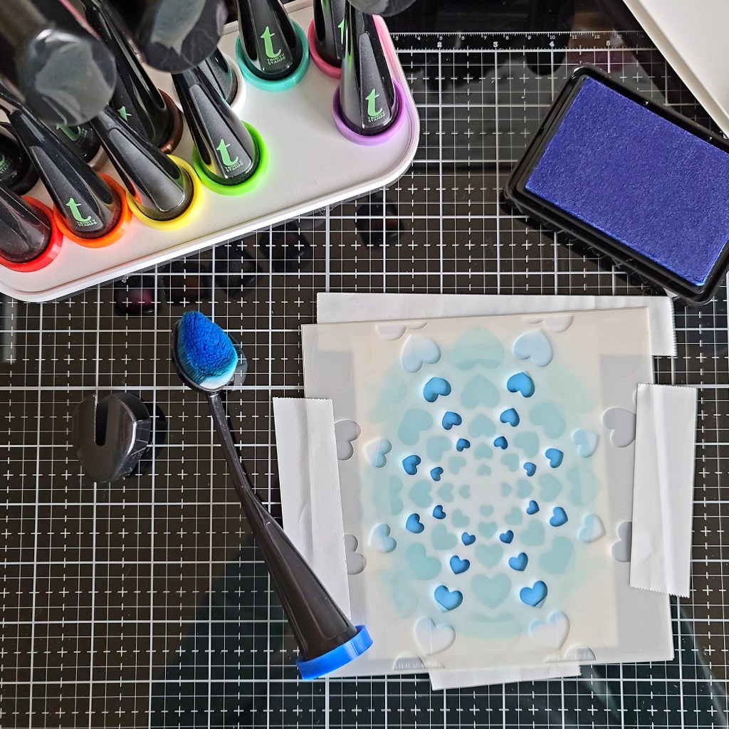 After that, I left the oval in place, removed the first layer of heartburst and lined up the second layer to add a blue ink to the mix and finish off my stenciling.