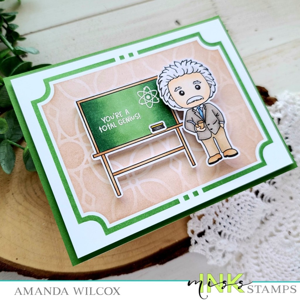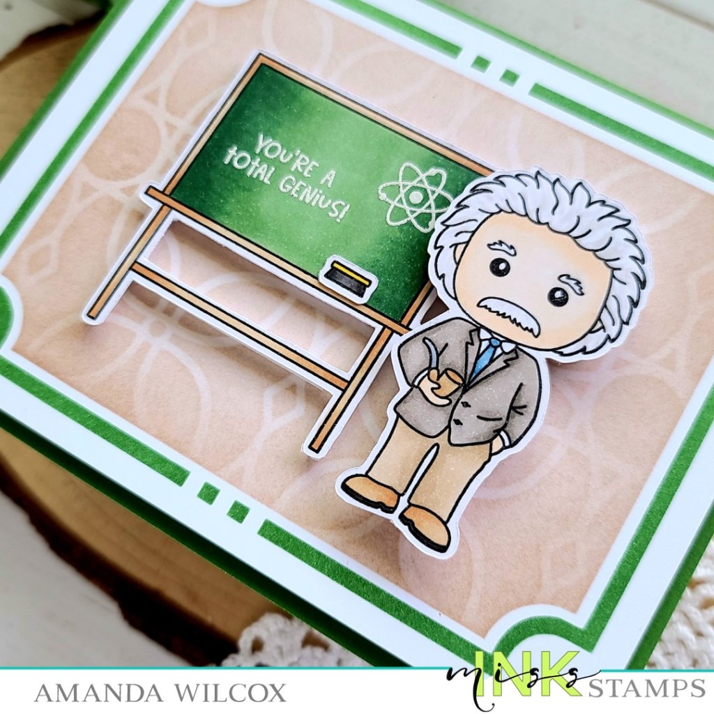 I found a green cardstock close to the ink, trimmed it to A2 and added it to a white card base with liquid glue. Then I popped my stenciled panel in place. Next, I stamped and heat embossed a sentiment in white along with another smaller atom image and glue the chalk board eraser in place. I added foam squares to the back of the chalkboard and Einstein, removed the release paper and popped them in place.