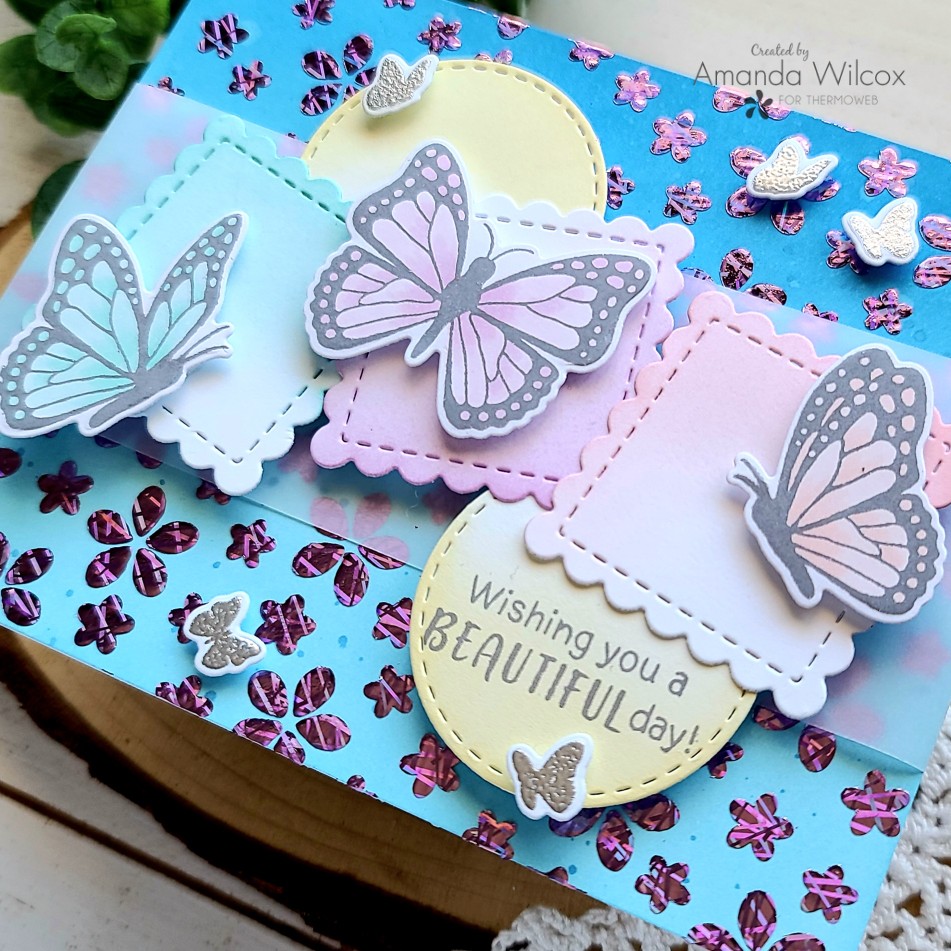 Once the transfer gel was dry and my laminator was heated up, I ran the flower panel through with purple sketch decofoil. It’s so beautiful and I just love the sketch line detail in this foil! I trimmed the panel down A2 size and wrapped a 2 inch strip of vellum around it before adhering the panel to a white card base. Next, I arranged the scalloped squares and circles how I wanted them and glued them together with liquid glue. Then I added foam squares to the back and placed them on the card front. Last, I added foam squares to the heat embossed butterflies and added them to my scene as well.