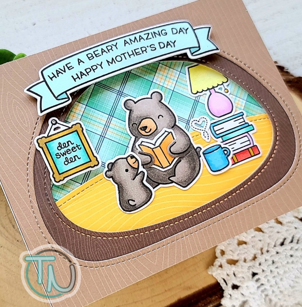 For finishing touches on this sweet card, I added glossy accents to the nail hanging the sign, bear noses, coffee mug, book spine and lamp pull knob. I added a little black glaze pen to the baby bear’s eye and Wink of Stella glitter brush pen to the frame, coffee steam and lamp shade.