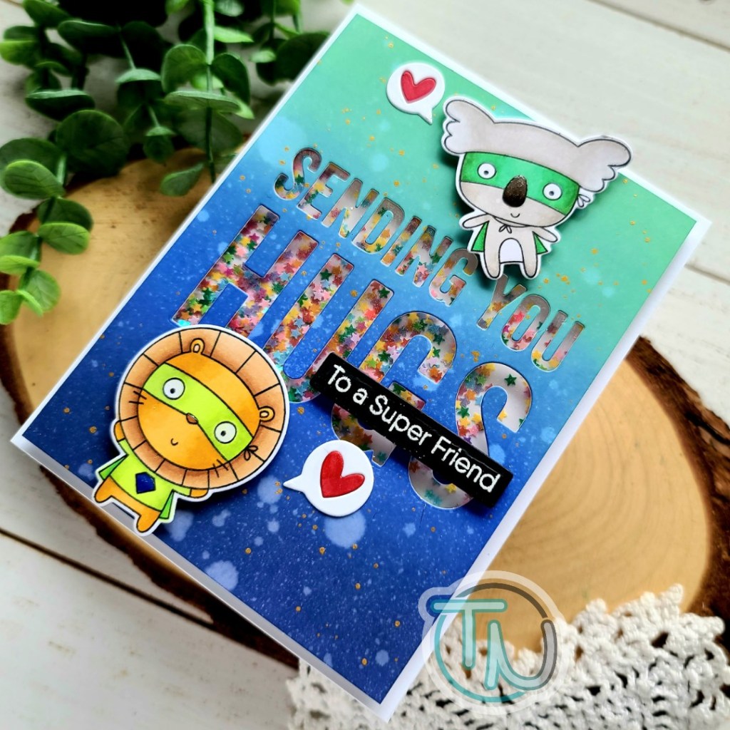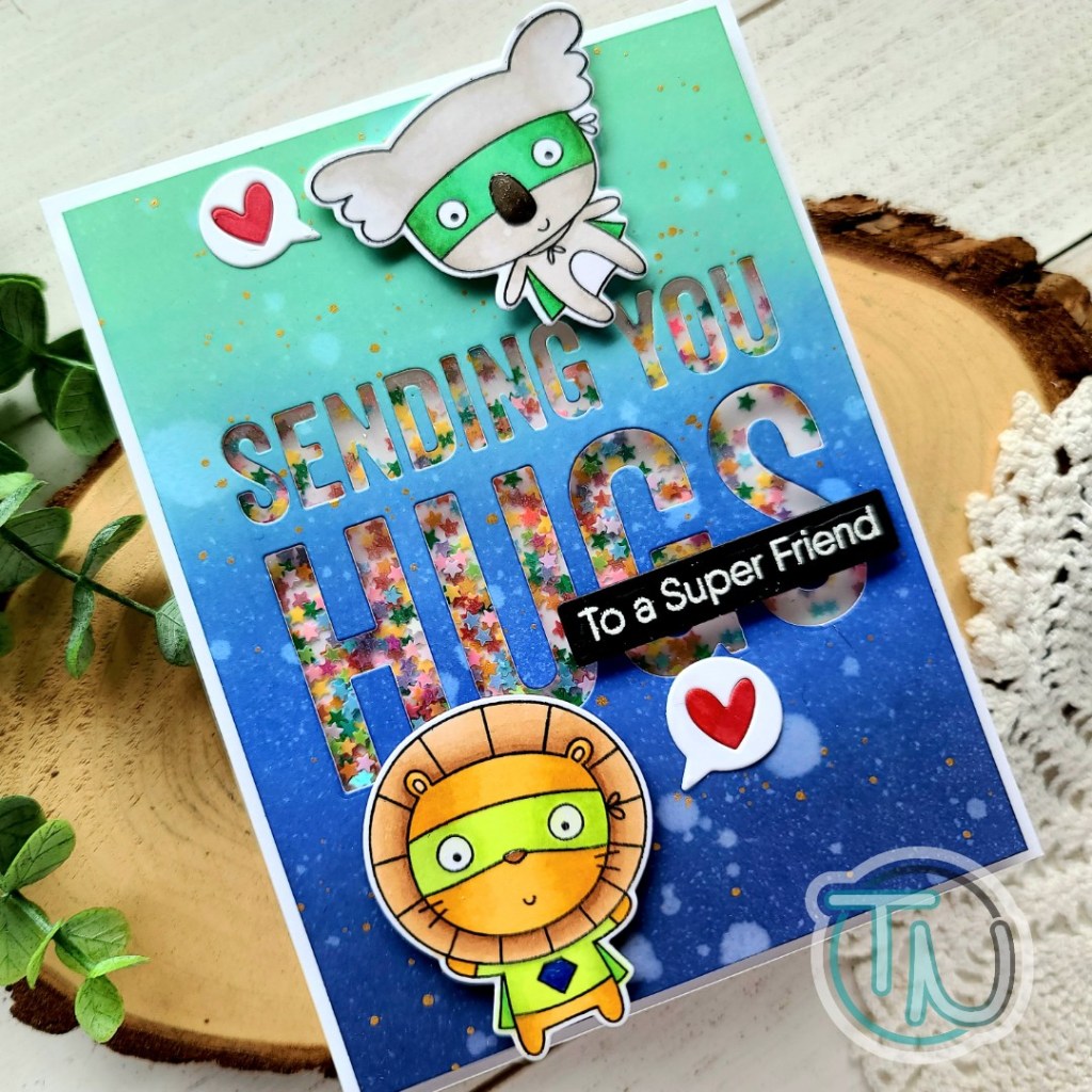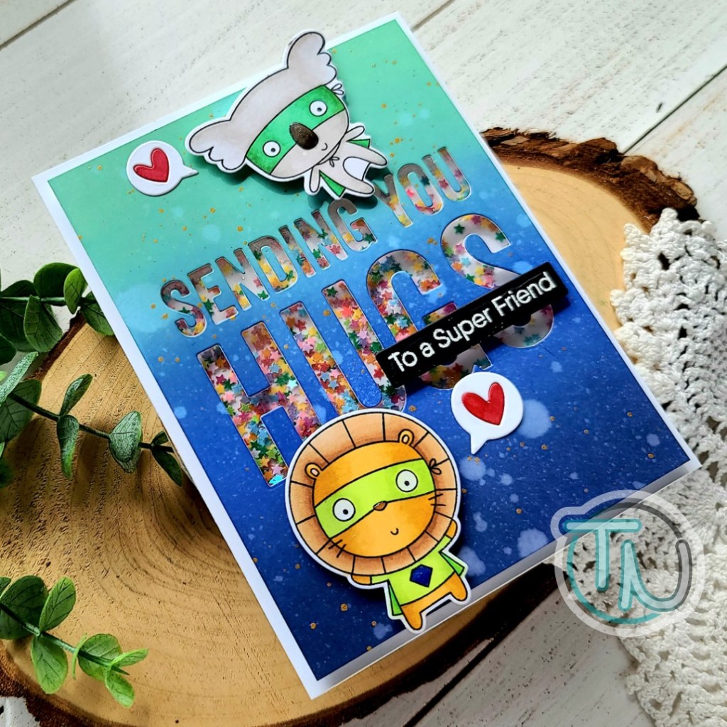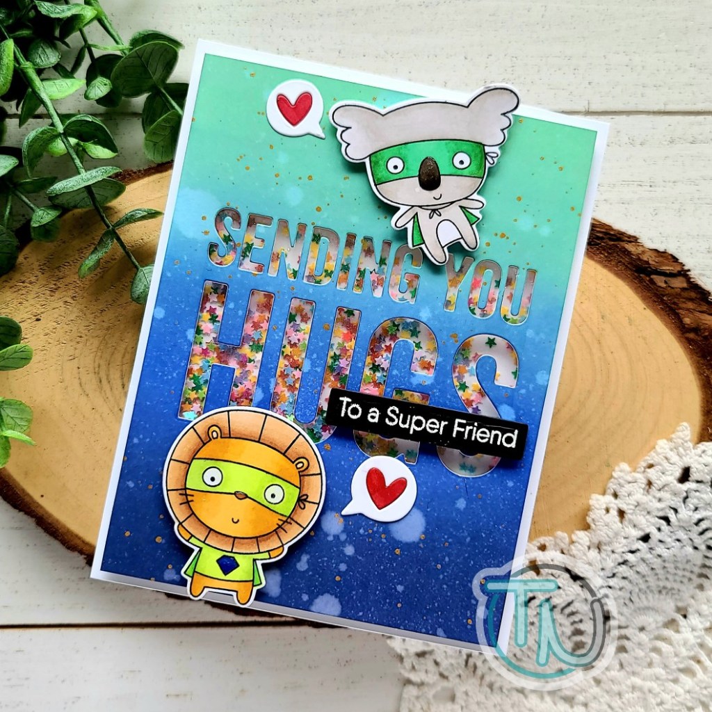 Hello everyone! I’m popping in today with a really fun card share featuring some MFT Stamps products that I just love! These Super Friend critters are just too cute and so fun to create with! I have had this Sending You Hugs die for a while and was excited to finally put it to use too!