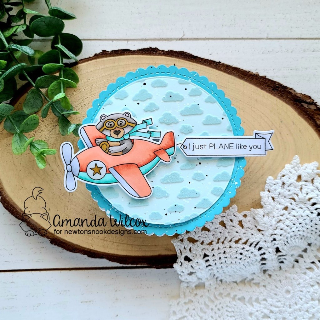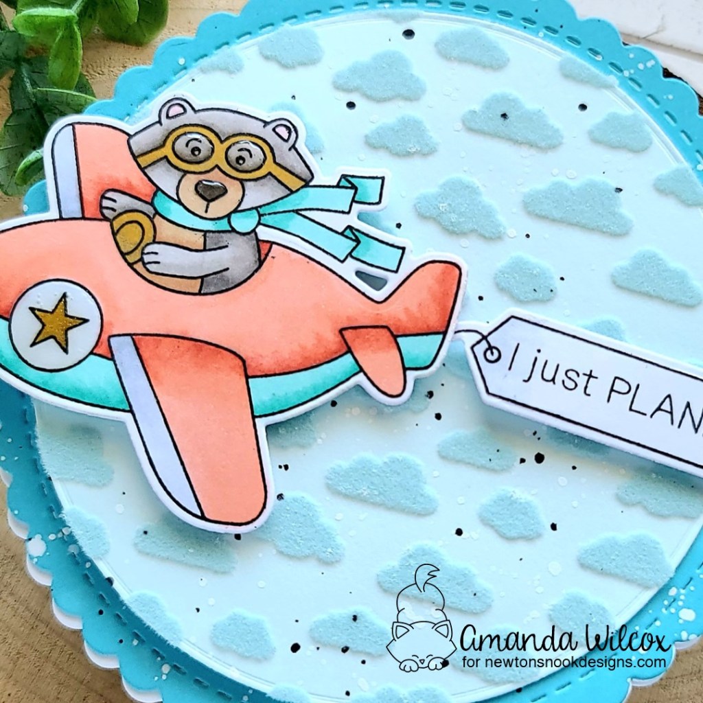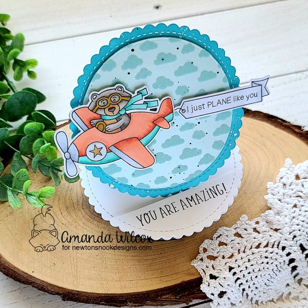 Here’s a look at the card front, flat like it would come out of the envelope. Isn’t it the cutest!?! I used Winston Takes Flight stamps and dies, along with the Circle Frames dies and the new Petite Clouds stencil.