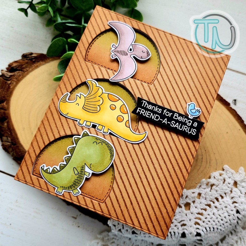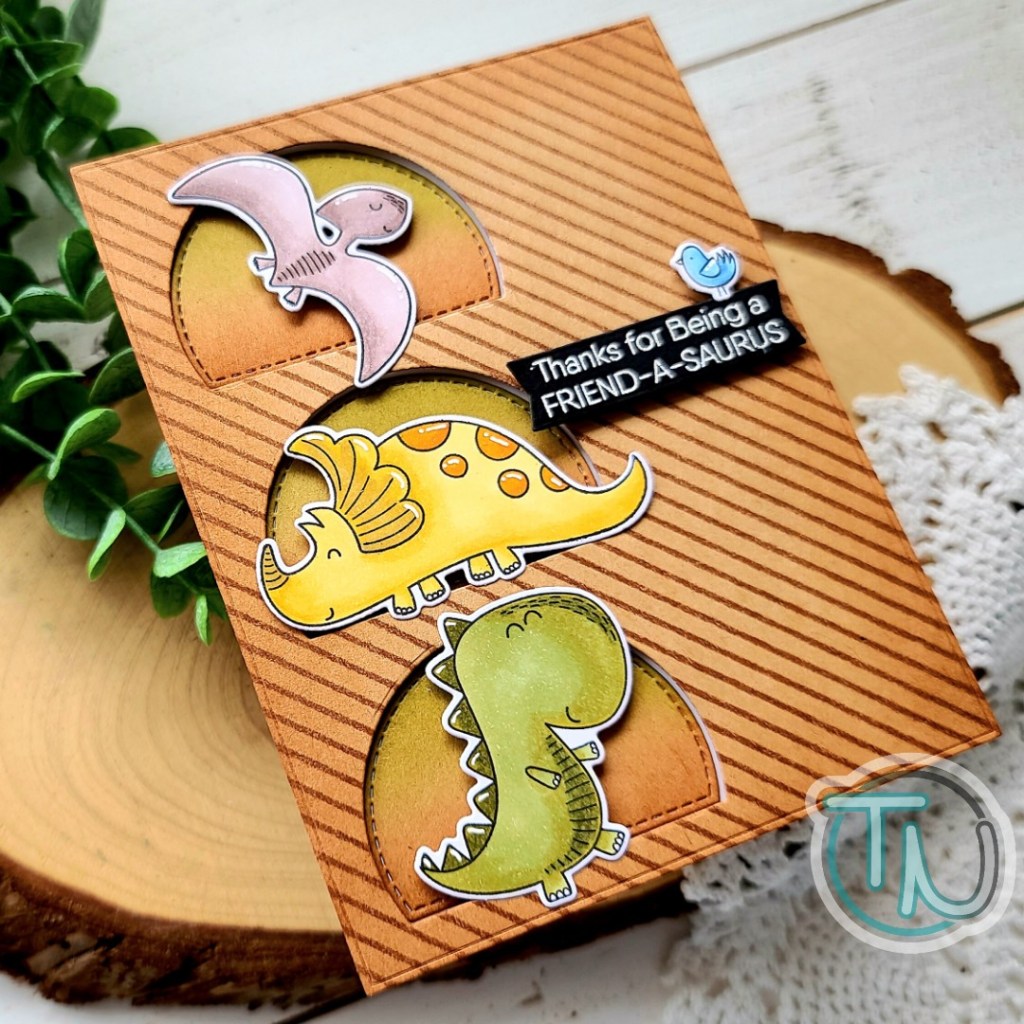 Hi again! I’m back with my second entry into the MFT Stamps Wednesday Sketch Challenge and it’s SO CUTE! I just had to pull out these sweet dinos that I got for Christmas! I’ve only used them one other time and was so happy to ink them up again!