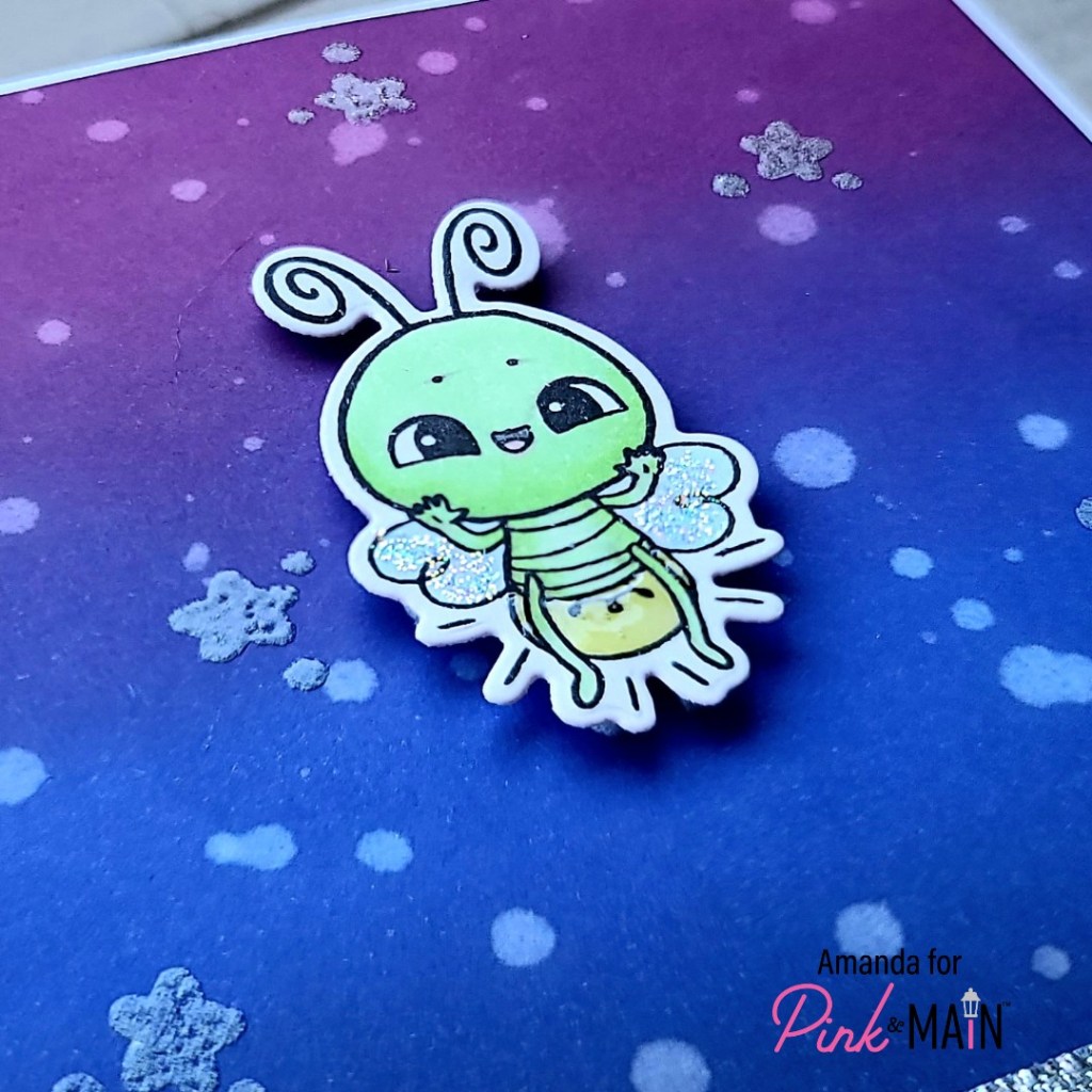 I chose one of the cute firefly images, stamped and colored him with copics, then used the coordinating dies to cut him out. He’s popped up with foam squares.