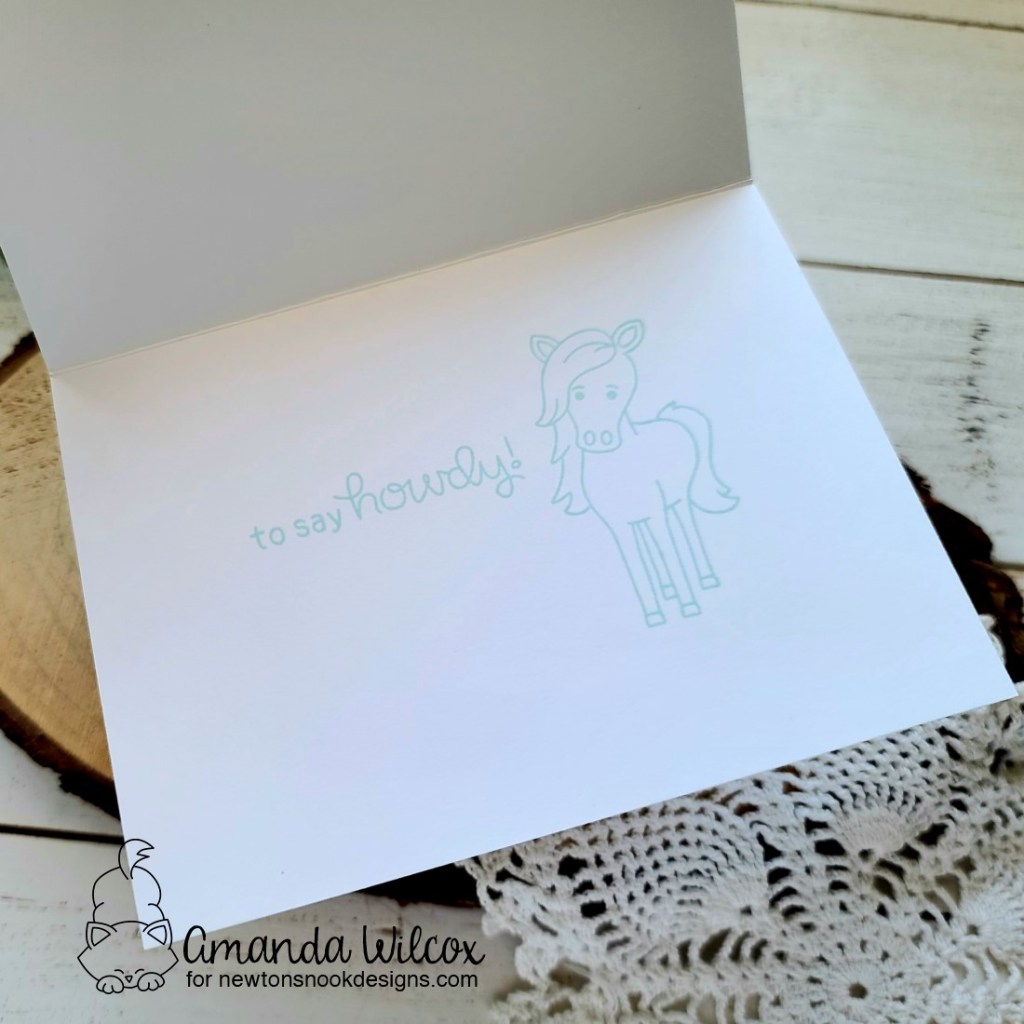 I glued one hay bail down with liquid glue and popped the horse, horseshoe and second hay bail up with foam squares. Next, I created a white card base and adhered a light teal panel to the front. Then, using the same ink as the stencil, I stamped the finishing portion of my sentiment and another horse on the inside.