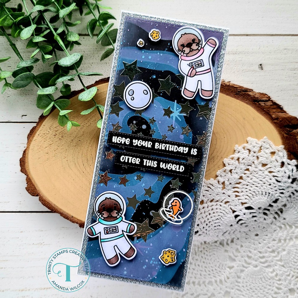 I’m back today with an out of this world card to share with you featuring some fun stamps and stencils from Trinity Stamps! Since it’s Trinity’s 3rd birthday, I’m sticking with the birthday theme as long as possible to keep the celebration going!