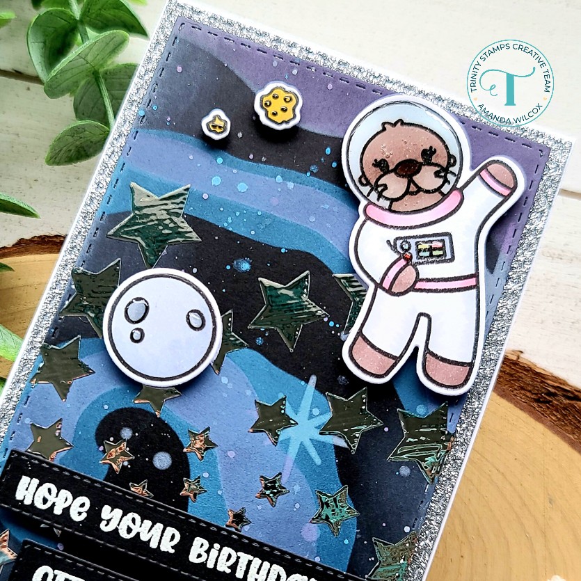 To start my card, I inked up a black cardstock panel with distress oxides using the space swirl stencil. Then I spread Thermoweb transfer gel blanco through the starstruck stencil and set it aside to dry. While it was drying, I turned my laminator on to heat up and stamped images from Otter Space to color with my copics. Then I used the coordinating dies to cut the images out. I stamped and heat embossed the bowl for the fish onto acetate and die cut it as well.
