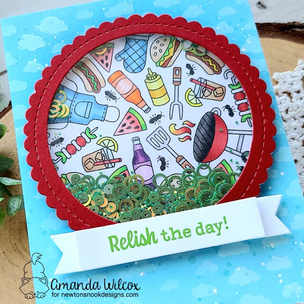 For the BBQ Roundabout card, I pre-die cut the scalloped circle from circle frames and then stamped the image on it. I find it easier to line up my image this way but you could do it the other way around too. Once it was stamped, I colored the whole thing with my copic markers. Then I die cut 2 more scalloped circles – one from acetate and another from red cardstock. With the red one I came back and die cut the next size down stitched circle from the center, leaving me with a frame. I adhered the frame to the acetate and then added foam tape around the edge to create me shaker mechanism. I sprinkled some embellishments on the colored panel and sealed it up with the shaker window.