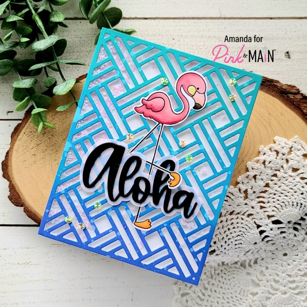 I sprinkled in some white primrose confetti bits and sealed it up with a white cardstock backing. Moving on to assembly, I used EZ Squeeze liquid glue to adhere the shaker to a white card base, then also adhere my die cut sentiment and flamingo.