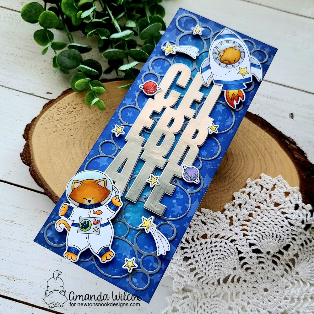 I started my card by stamping images from Cosmic Newton and colored them with my copic markers. Then I used the coordinating dies to cut them all out and set them aside. Next, I die cut the Crafty Meraki Bubble Mania die from gray cardstock. I also die cut “celebrate” from the Celebrate Tag die set from white cardstock 3 times and brushed silver once. I used liquid glue to adhere the letters and moved on to get inky with my background!