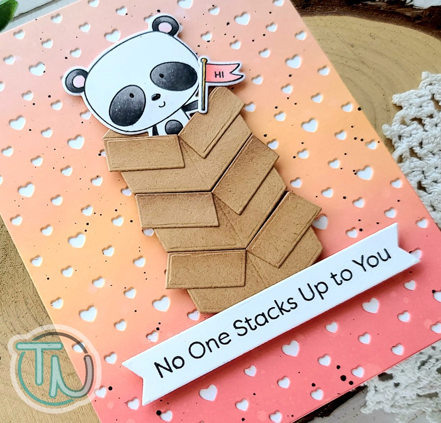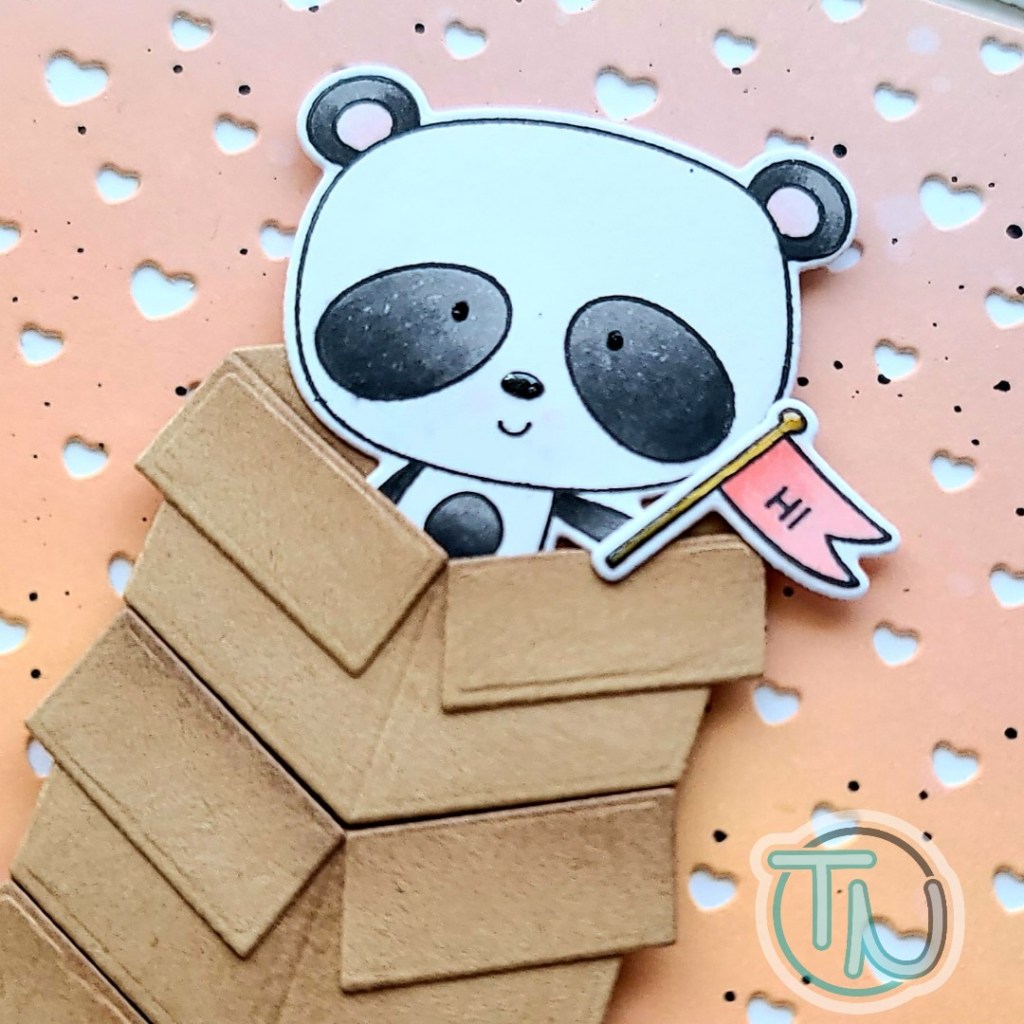 Next, I stamped the panda and a flag from MFT Stamps Weather With You stamp set and colored it with my copic markers. I used the coordinating dies to cut them all out and used liquid glue to adhere them inside the stacked boxes.