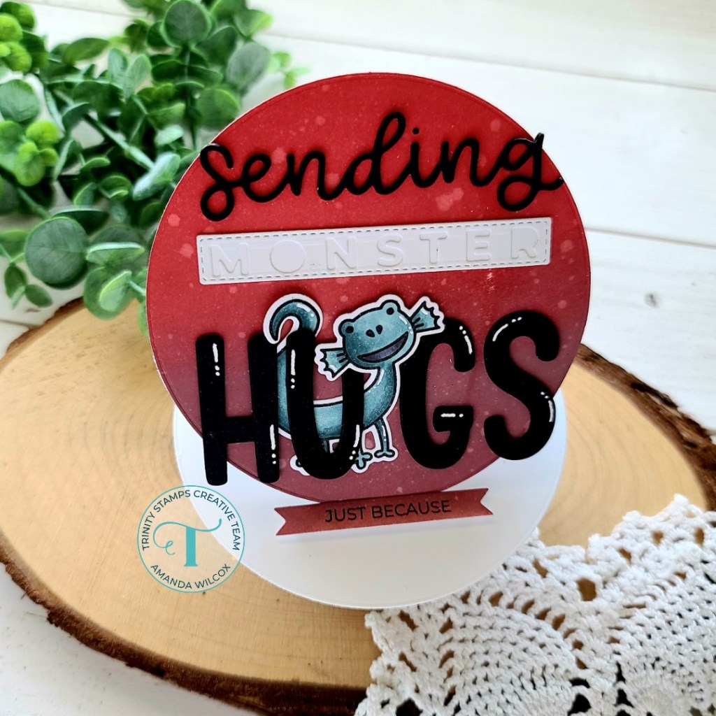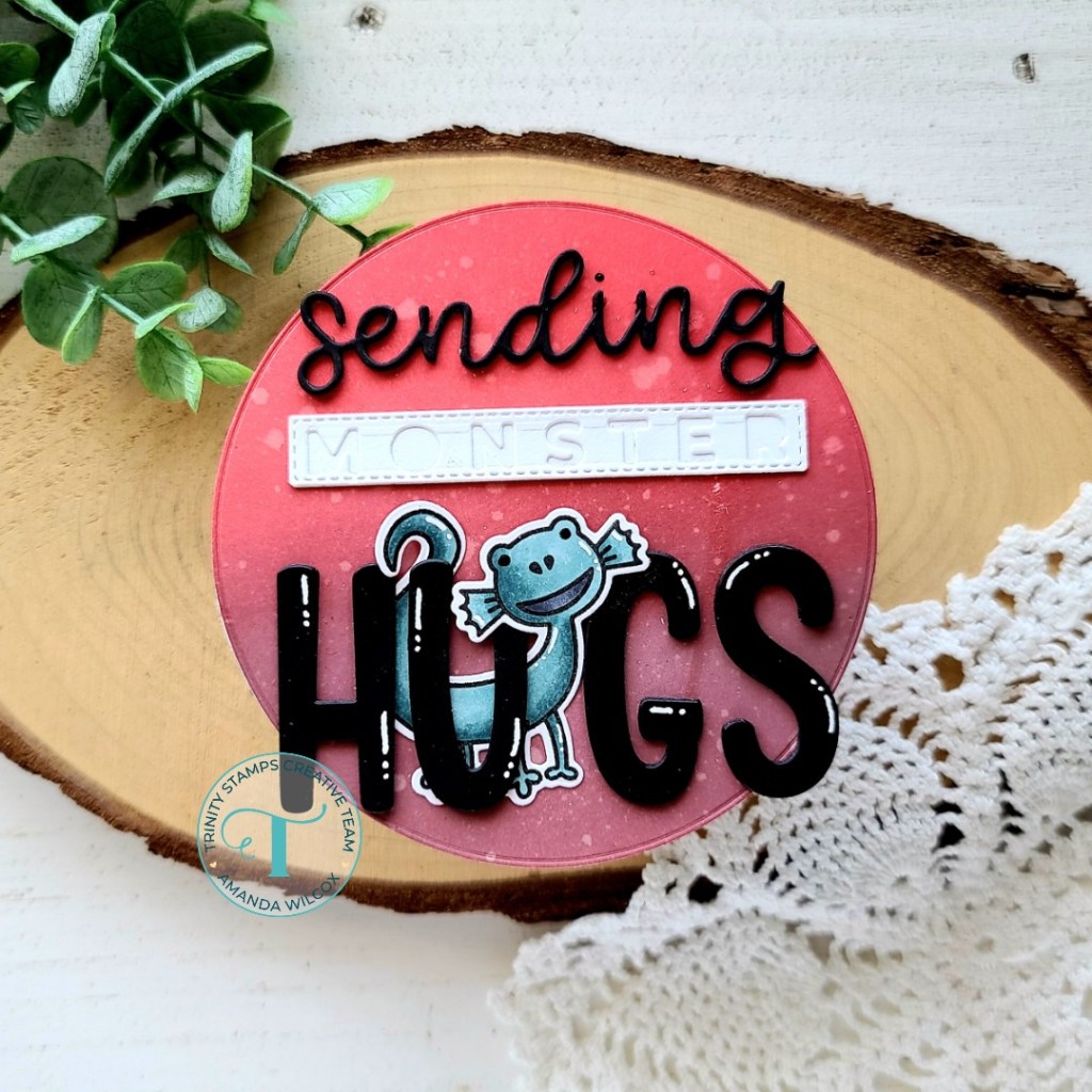 For finishing touches on this card I added black glaze pen to the monster’s eyes and then white gel pen accents to the letters in “hugs” and on the monster too. Instead of trying to keep track of all of the little dots for the “i” in sending, I let them fly wherever they may and used Nuvo Crystal Drops in black ebony to add my own dot. So much less stress and you’d never know.