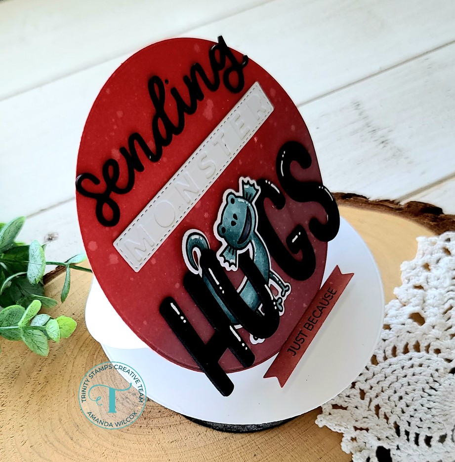 To decorate the front of my card, I used the Sending Hugs dies and cut the elements from black and white cardstock. I like to layer my letters for extra dimension so sending and hugs are cut 4 times and glued together. I adhered “sending” and “monster” to the card front, then carefully wrapped my monster between the “hugs” letters and glued them all together before gluing them to the card front.