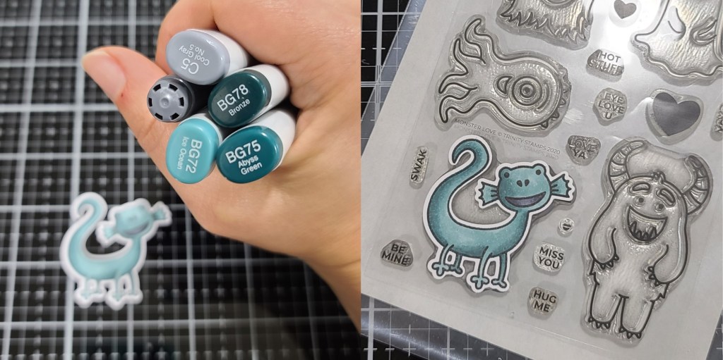 I just love monster themed things so I find myself going back to these great stamps and dies! For this card, I started by stamping one of the monsters from Monster Love and colored it with my copic markers. Then I used the coordinating dies to cut it out.
