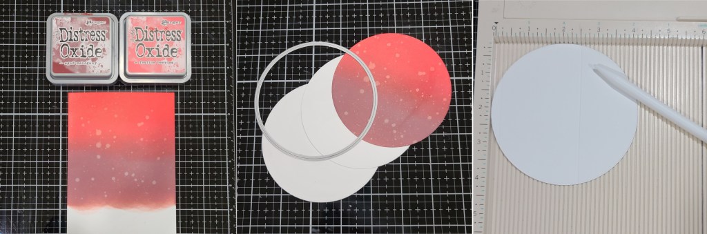Now to switch to the card front and base. It’s not really as difficult as it looks. I broke it down into simple steps. First, I ink blended a white panel with distress oxides inks – festive berries and aged mahogany. I spritzed the panel with water and let it dry. Then I die cut it with the largest Embossed Edge Circle die, plus 2 more white circles the same size. Then I scored one of the white circles at 1/4 inch and 2 1/2 inches.