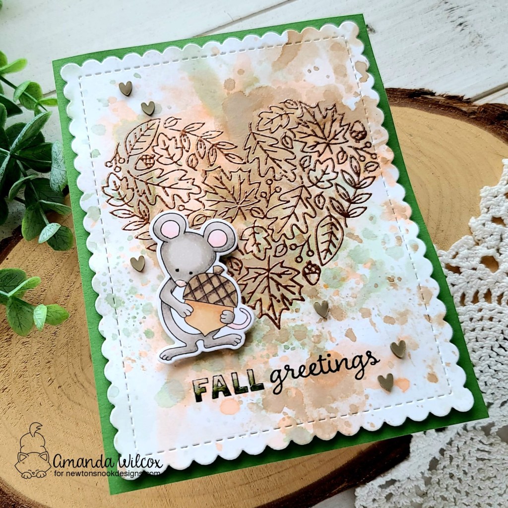 For finishing touches I added glossy accents to the word “fall” on the sentiment, the mouse’s nose and black glaze pen to his eyes. Last, I glued a scattering of brown clay heart embellishments around the design.