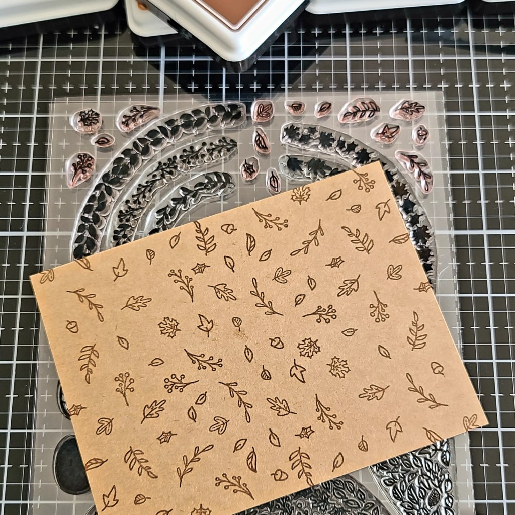 Next, I took a kraft panel and placed it in my MISTI. I pulled out all of the individual leaf stamps from the set and created a cluster. I stamped it and then rotated my paper and stamped it again. I rearranged the stamps and did it again. This left the center with a few gaps which I filled in individually. Then I trimmed this panel down to 4×5.25 inches and added foam tape to the back.