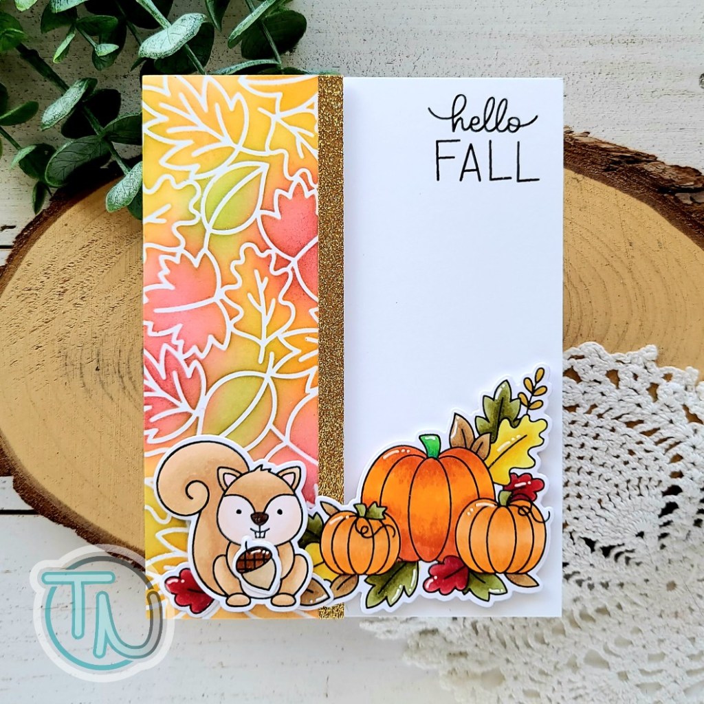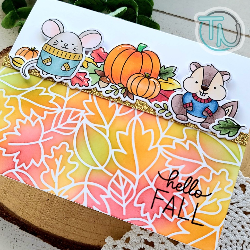 Hey friends! Last weekend I got my most recent Pretty Pink Posh release order and could not wait to play! I inked up those sweet Cozy Fall Critters and colored my heart out! Then I had to play with the new Leaves Background stencil too! After I inked up a large panel with the stencil I cut it down for my first card which left me with a good size strip left and I couldn’t just waste it so I made another card to share too!