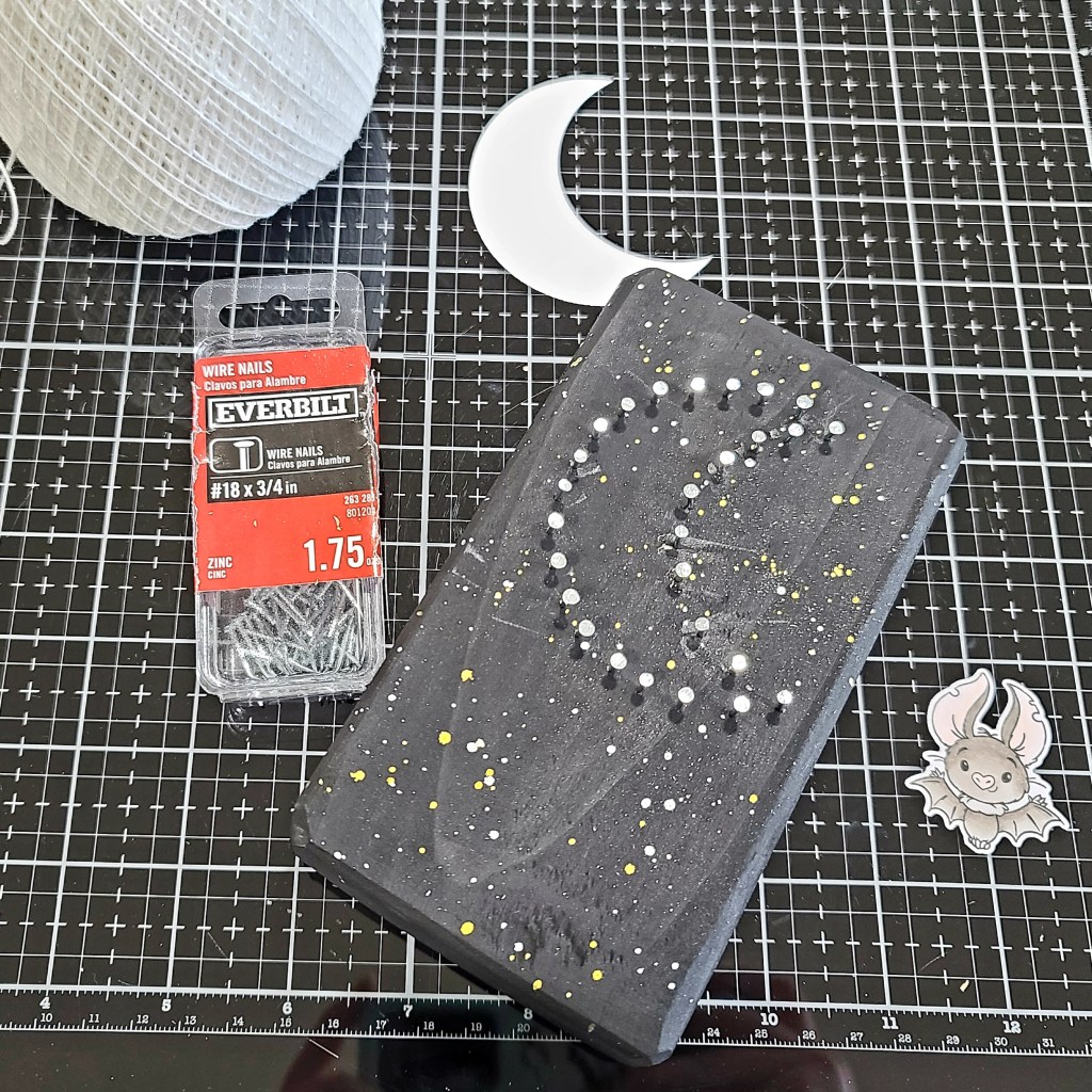 To make a template for my moon, I die cut a circle from white cardstock and then I took the circle one size smaller and cut the side off, creating a crescent shape. I placed it on my block and used a pencil to make dots about 1/2 inch apart, maybe a little more. If you’re more comfortable, you could mark on your cardstock first so that you know if you like the spacing or not. I’ve done enough of these to just wing it now.
