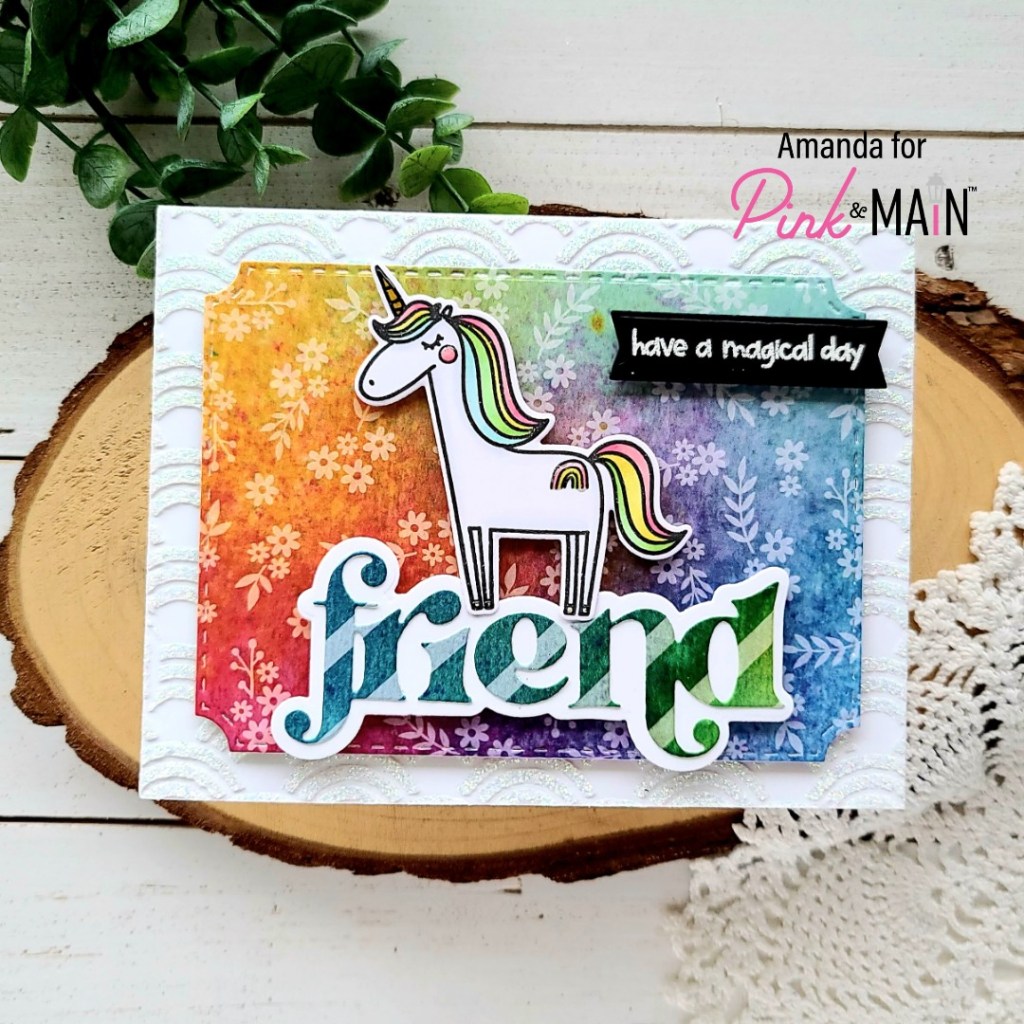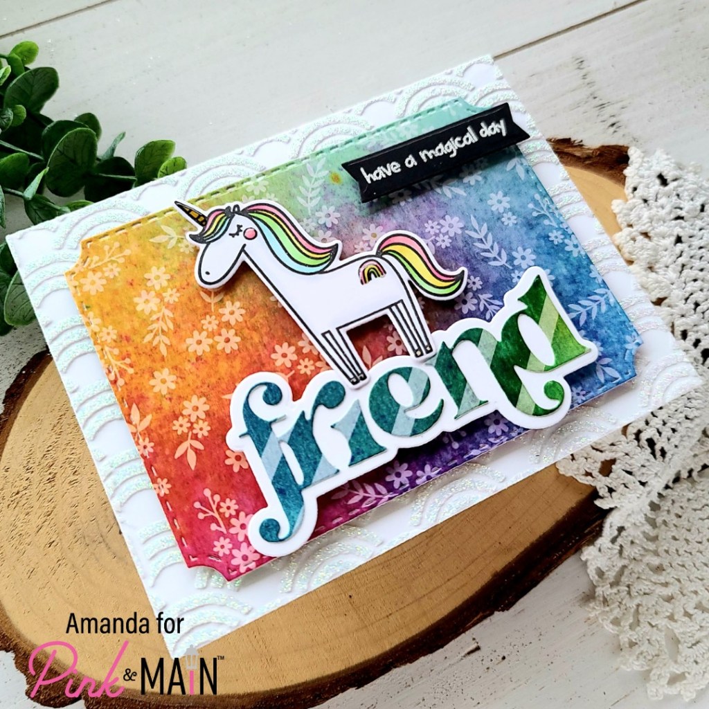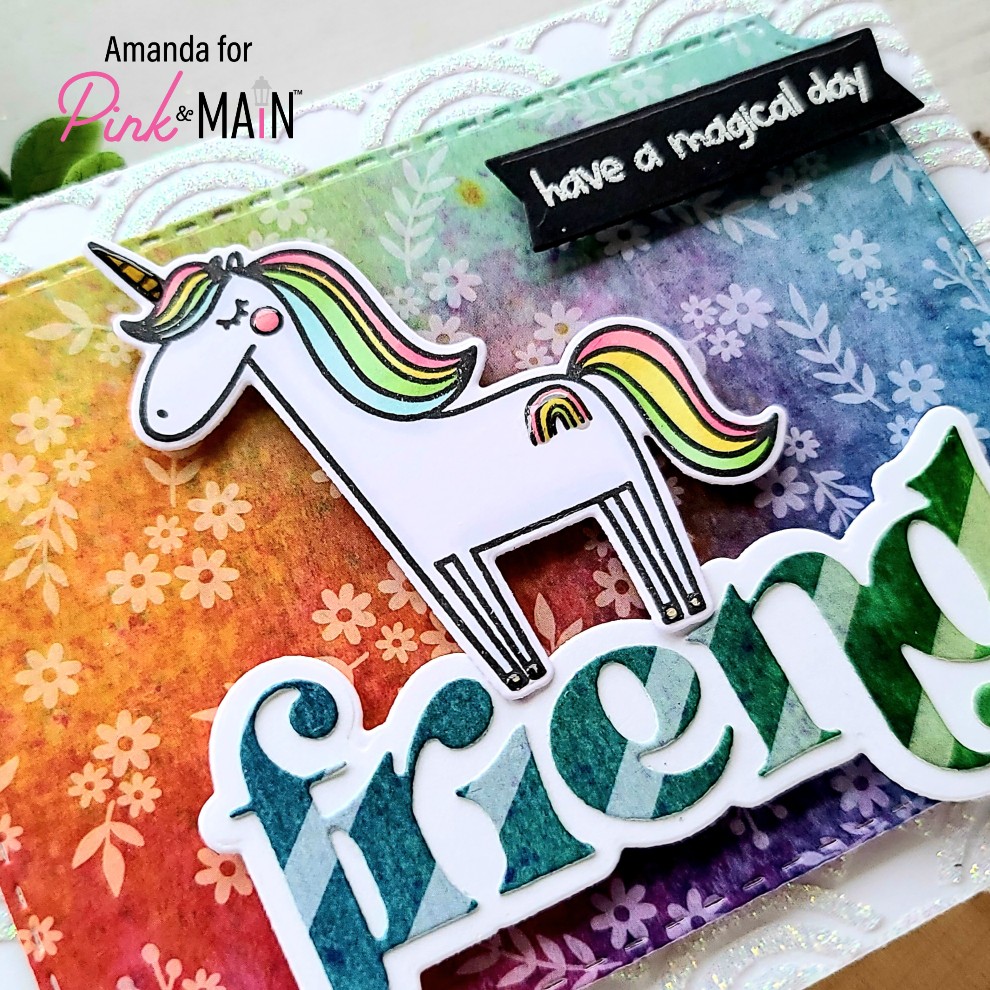 Instead of having a plain white background, I decided that a fun unicorn card needed some bling so I spread iridescent glitz glitter gel through the new Rainbow Fun stencil! After that was dry, I cut the panel out with the largest Layered A2 Rectangle die and adhered it to a card base.