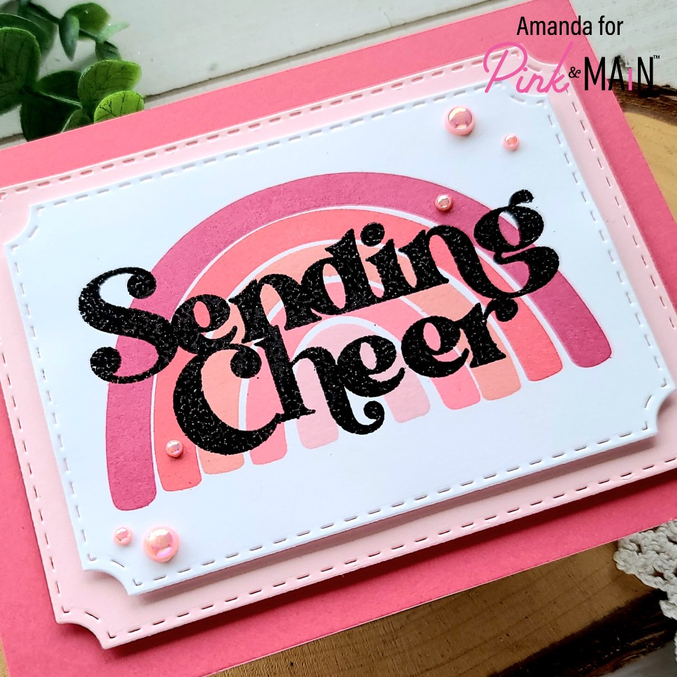To create my card, I die cut the smallest size in the notched corners die set from white cardstock and placed it in my MISTI, then I stamped each layer of the Sending Cheer rainbow with a different color of pink dye ink. Next, I stamped and heat embossed the sending cheer sentiment in black.