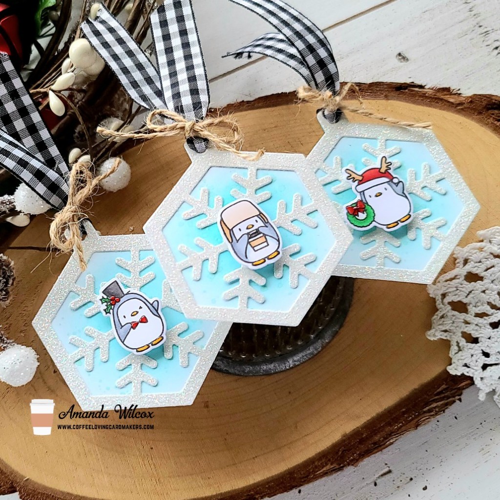 Then I chose 3 penguins from the Little Agenda Penguin stamp set and colored them with my copic markers. I used the coordinating dies to cut them out and popped them in the center of each snowflake with foam squares. Next, I threaded black gingham ribbon through the tag hole and tied it with twine.