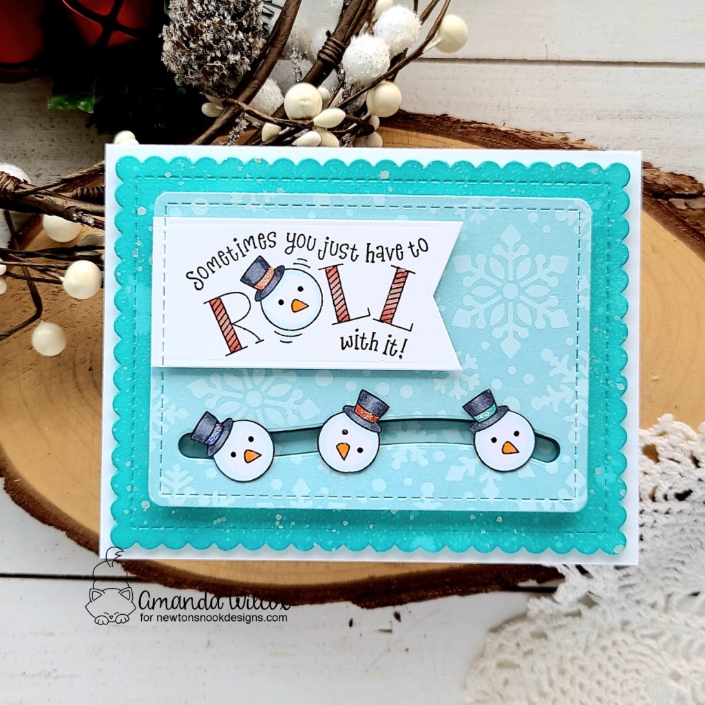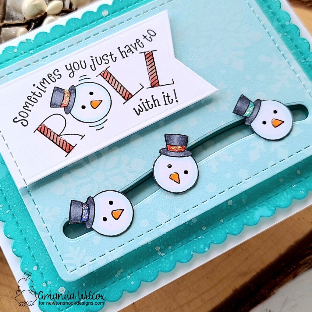The background panel is inked with evergreen bough and mermaid lagoon distress oxide inks and spritzed with water. It’s popped up on a white card base with foam tape. Then I cut a rounded rectangle from the same die set and inked it up with the Snowfall stencil again. I used a slider die to cut a channel and added foam tape to the back, being sure to leave room for the heads to roll from side to side.