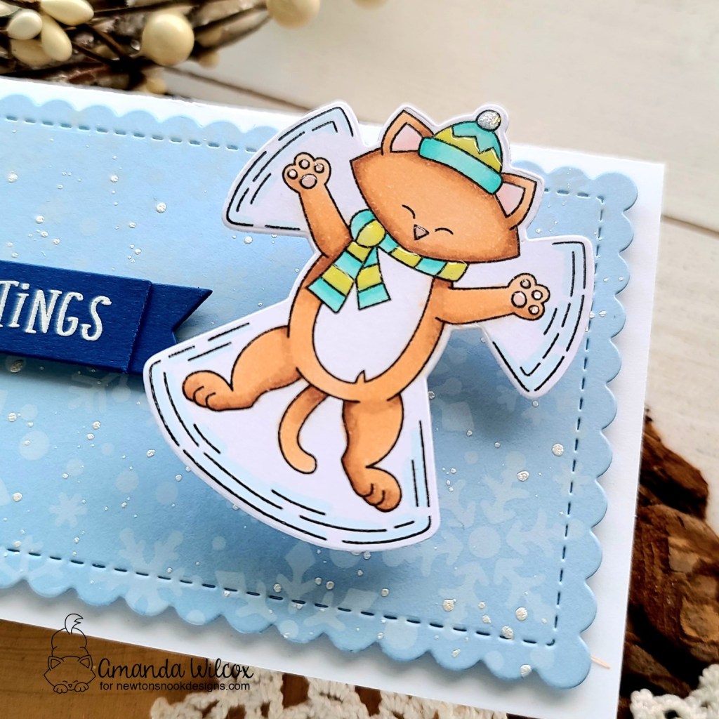 I die cut a light blue panel with the scalloped rectangle from Slimline Frames & Portholes and inked it up with white ink and the Snowfall stencil. Then I flicked pearl watercolor all over it for a magical feel. Next, I stamped and heat embossed a sentiment from Snowfall Roundabout on a banner from the Banner Trio dies. I used foam tape to add the background panel to a white card base and foam squares for the banner. Finally, I removed the release paper on the action wobblers and added the sweet Newton and Puppy!