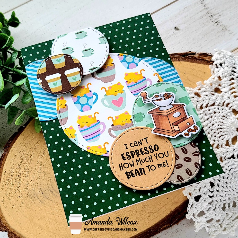 I chose an array of papers and grabbed the circle frames dies and the frames squared dies (for the circles in it, haha) and started cutting out different size circles. I also cut one from kraft cardstock and stamped a sentiment from Time for Coffee on it.