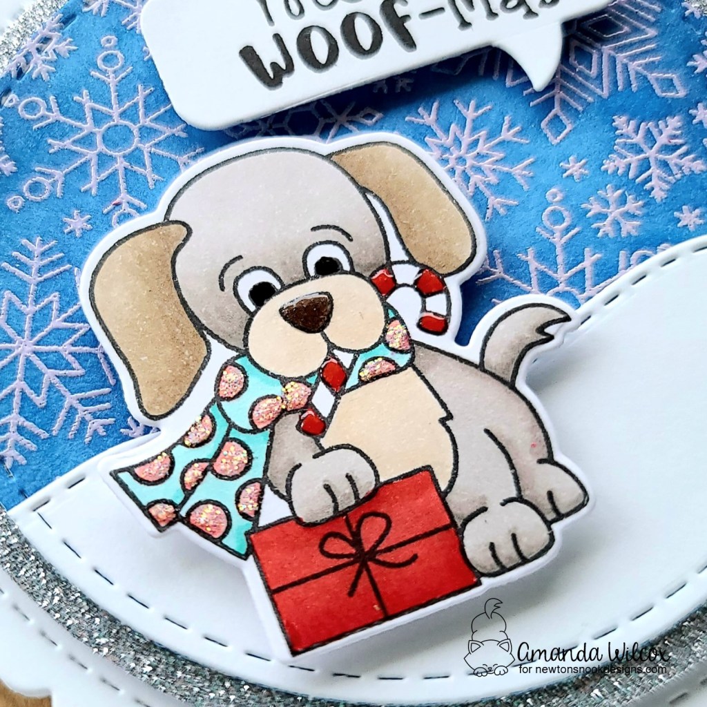 I started by adhering the snow drift to the snowfall panel with liquid glue, then I popped up the puppy and speech bubble with foam squares. The snowfall panel is glued directly to the silver glitter circle and that is popped up with foam tape.