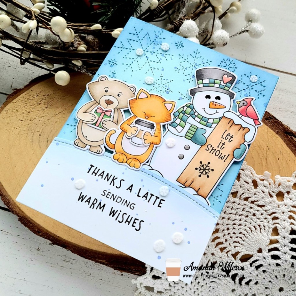 Last, I added my images with foam squares and liquid glue and switched over to finishing touches. For that I added glossy accents to the snowman nose, buttons and heart, and the other critter noses and beaks too. Then I added black glaze pen to the eyes with a little white gel pen highlight on Winston. So that everyone had a little shiny interest I also added glossy accents to the coffee cup lid and ribbon on the gift. Then to complete my scene I adhered a scattering of snowflakes from Twiddler’s Nook’s Snowy Day embellishments.