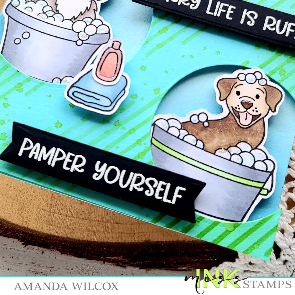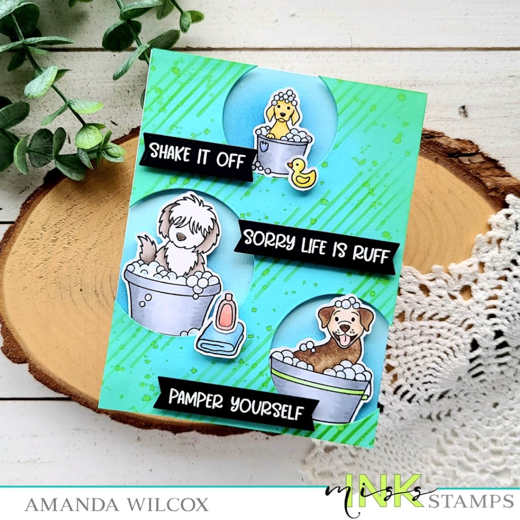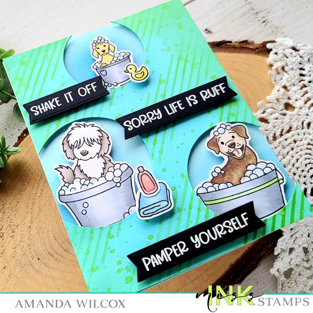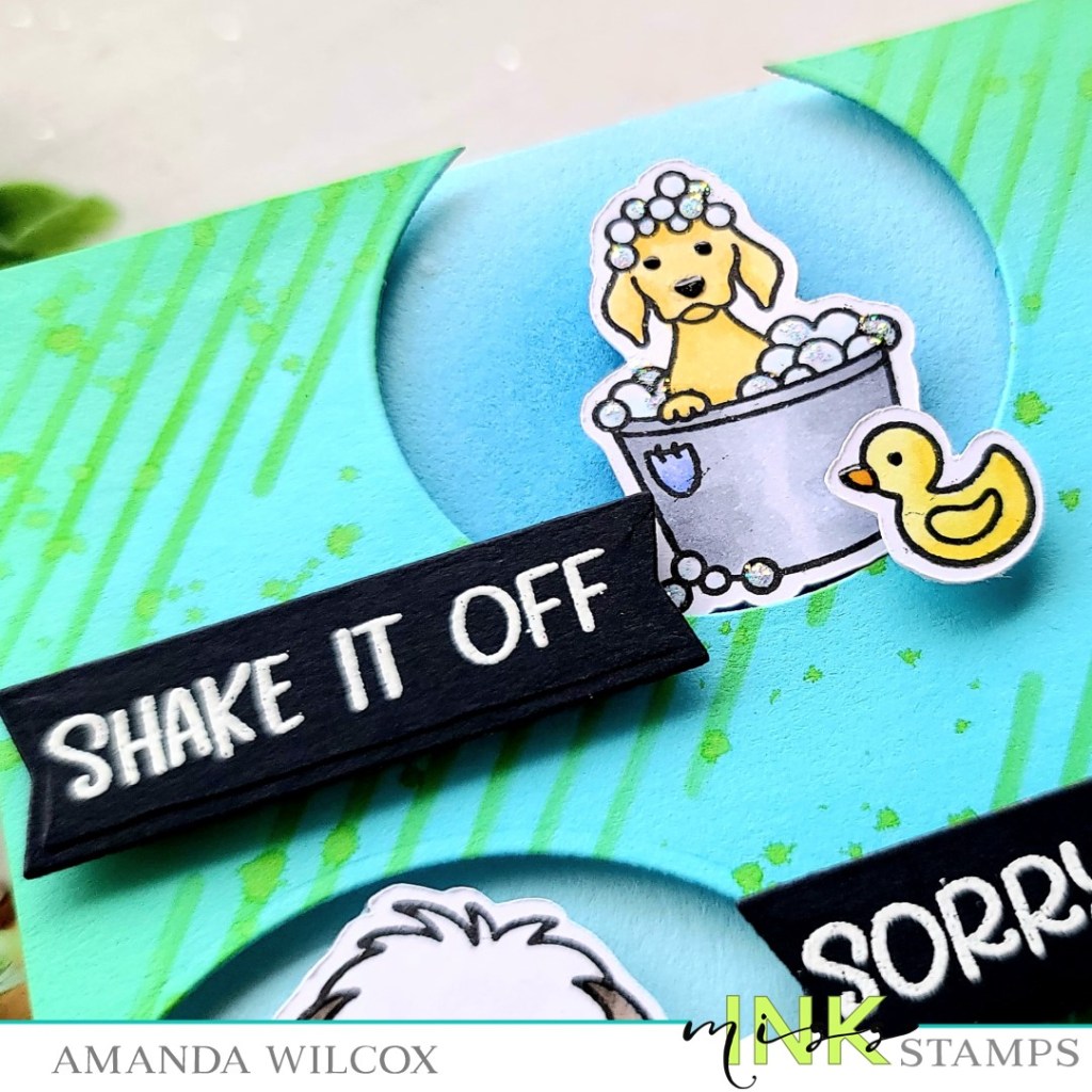 To create my card, I stamped a few of the pups and some accessories and colored them with my copic markers. I used the scan-n-cut to cut them out and set them aside. Then I took a blue panel and the Between the Lines stencil and inked it up with a green dye ink and a blending brush. Next, I pulled out my set of circle dies, chose 3 sizes that fit the dogs and cut holes in my panel. I thought the panel was a little stark so, without adding more ink to my brush, I inked up the edges of the cardstock. Then I flicked watered down ink all over the panel for extra texture.