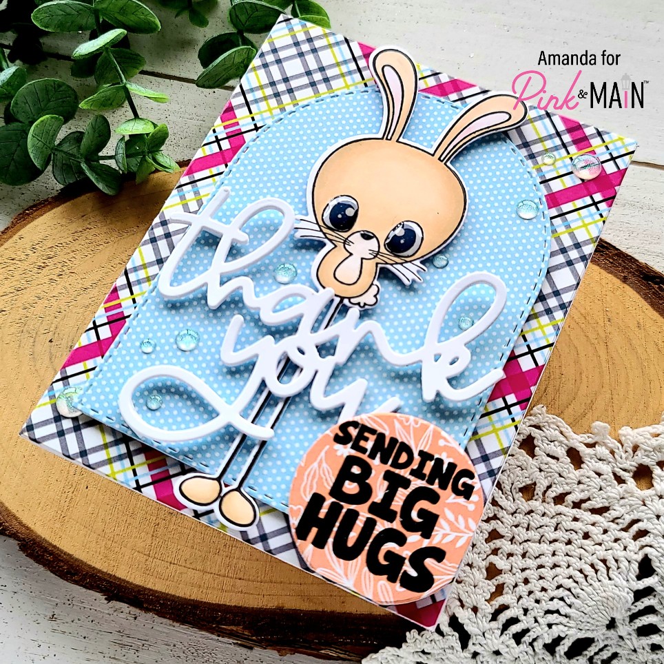 I adhered the plaid paper to a white card base and popped the stitched arch up with foam tape. Then I popped the bunny up with foam squares, doubling the squares on his feet and tips of the ears so it lays flat. I carefully added some foam strips to the back of the “thank you” dies and added them over those awesome long legs. Last, I added the big hugs circle and trimmed off anything hanging over the edge.