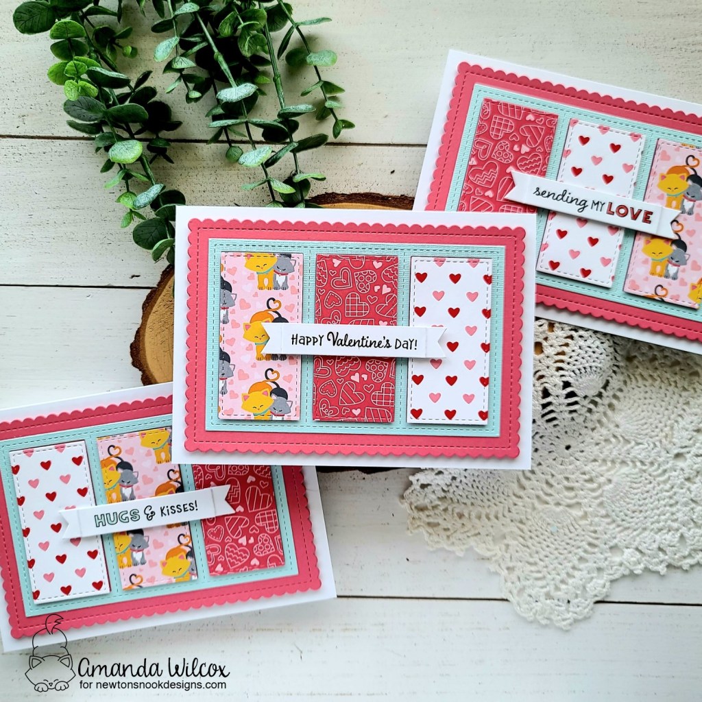 Next, I have a super fun and quick to make set of Valentine cards featuring the new A7 Frames & Banners and the Love & Meows paper pad.
