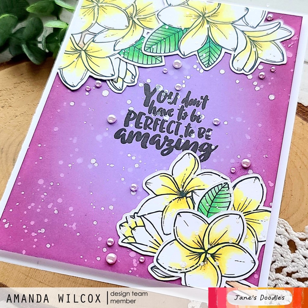 Hello everyone! It’s a busy day on the blog today. I’m also sharing this beautiful card using the Jane’s Doodles Plumeria digi stamp set and You Got This sentiment stamps. I love these type of floral cards with bright berry purple backgrounds. I’m just always drawn to it.
