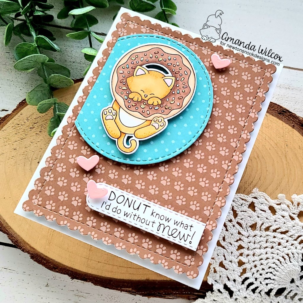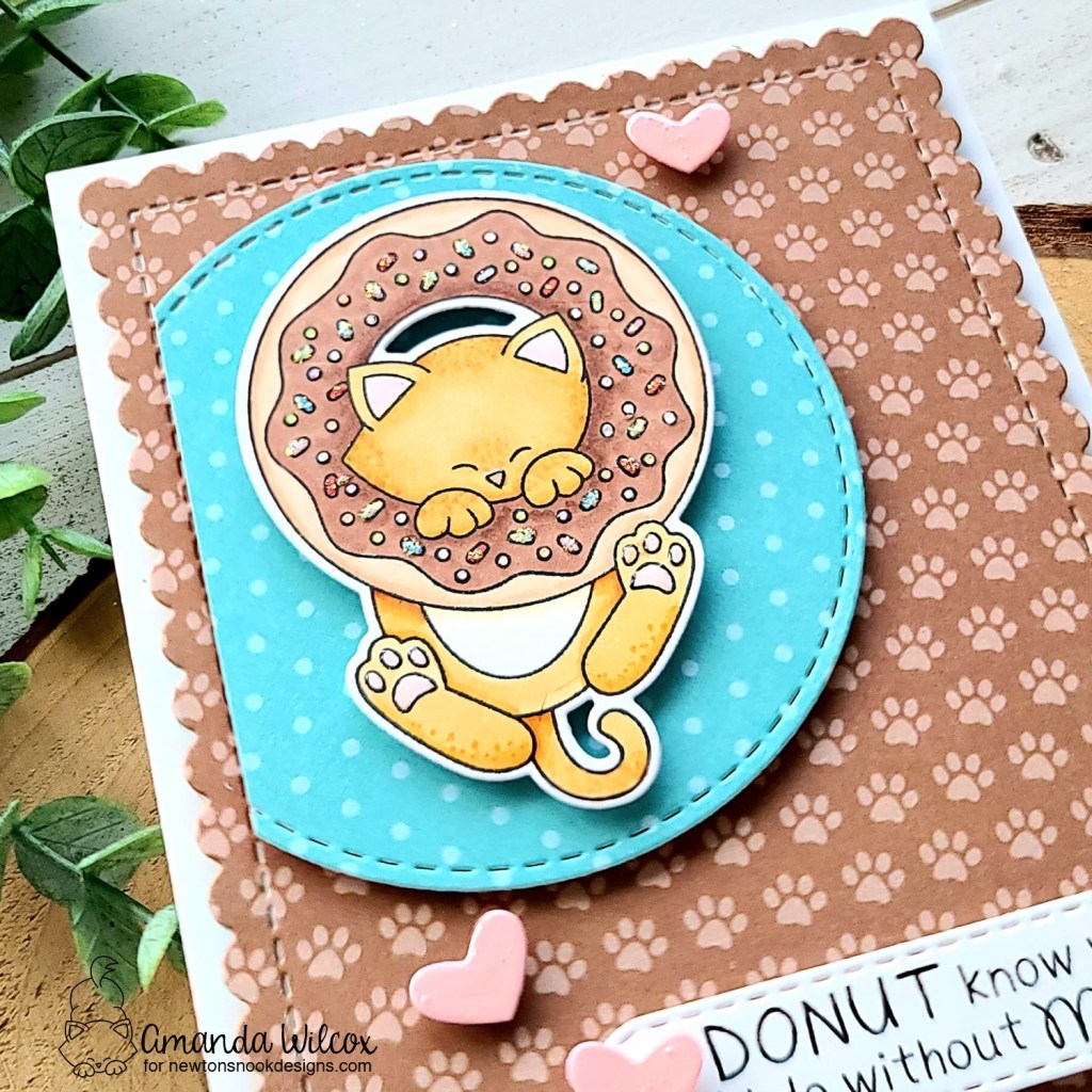 I started by stamping and coloring my image from Newton’s Donut with my copic markers. Then I used the coordinating dies to cut him out. Where I had a general design in mind, I hadn’t chose details like backgrounds and such. So I went digging in my stash for a stencil or something that fit but nothing was working. Then I pulled out the new Love & Meows paper pad and found these fantastic patterned papers and everything just fell into place.