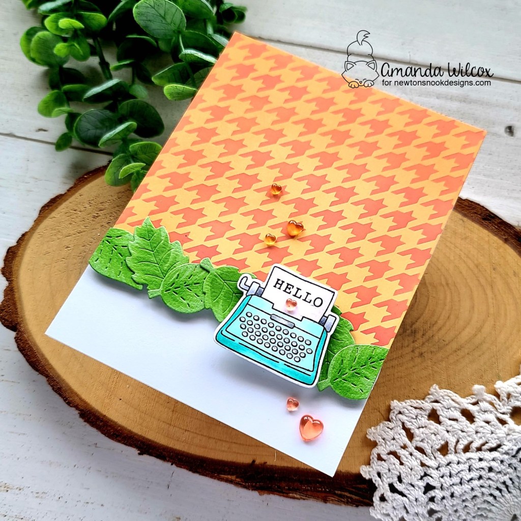 I started by inking up a panel with dried marigold distress oxide ink, then I took the Houdstooth stencil and inked Lawn Fawn guava ink through that with a blending brush. Next, I die cut some leaves from the Flower Trio die set and gave them some detail with a copic marker.