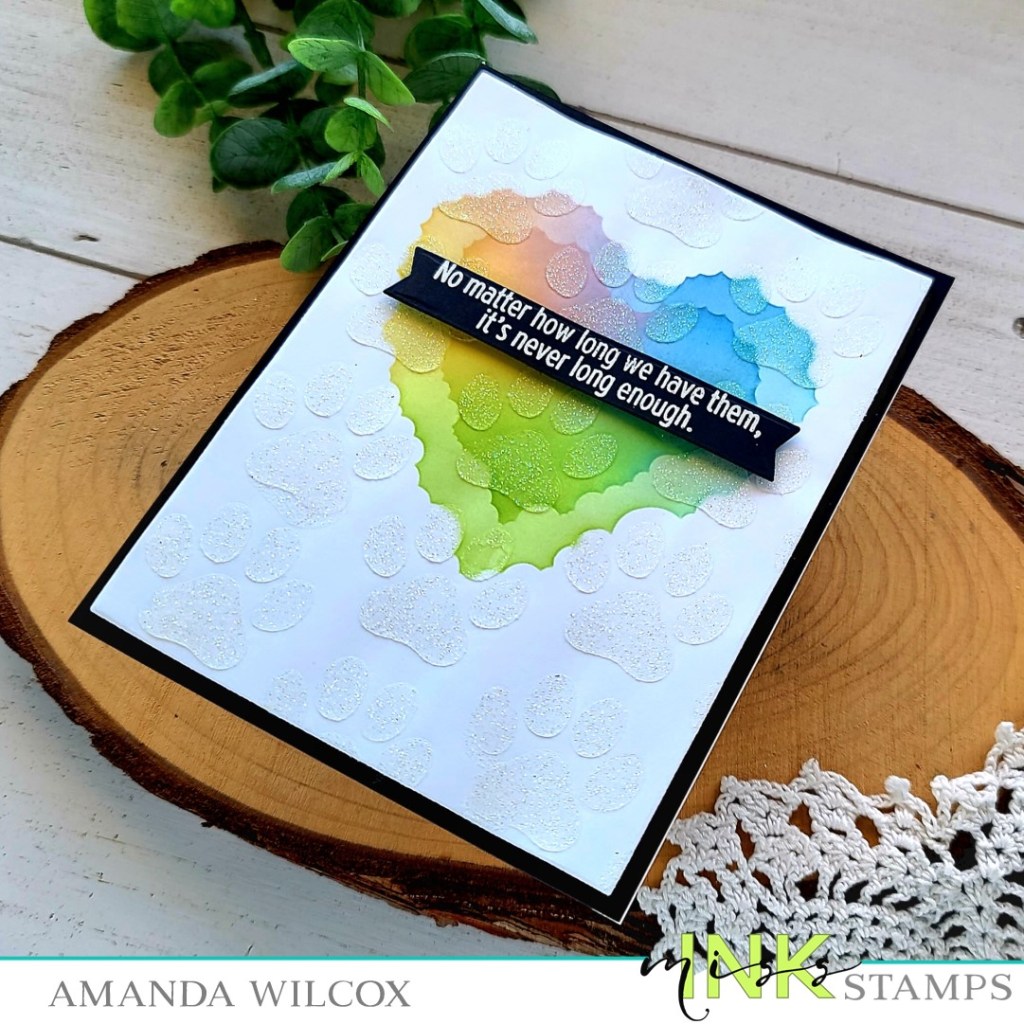 I started by inking up both layers of the Cloud Hearts stencils in a rainbow fashion. In my mind this was like the reference to animals crossing the rainbow bridge. Once both layers were completed, I removed those stencils and taped down the Big Paws stencil and spread Lawn Fawn fairy dust stencil paste through it for a subtle glittery look of paws over the whole card front.