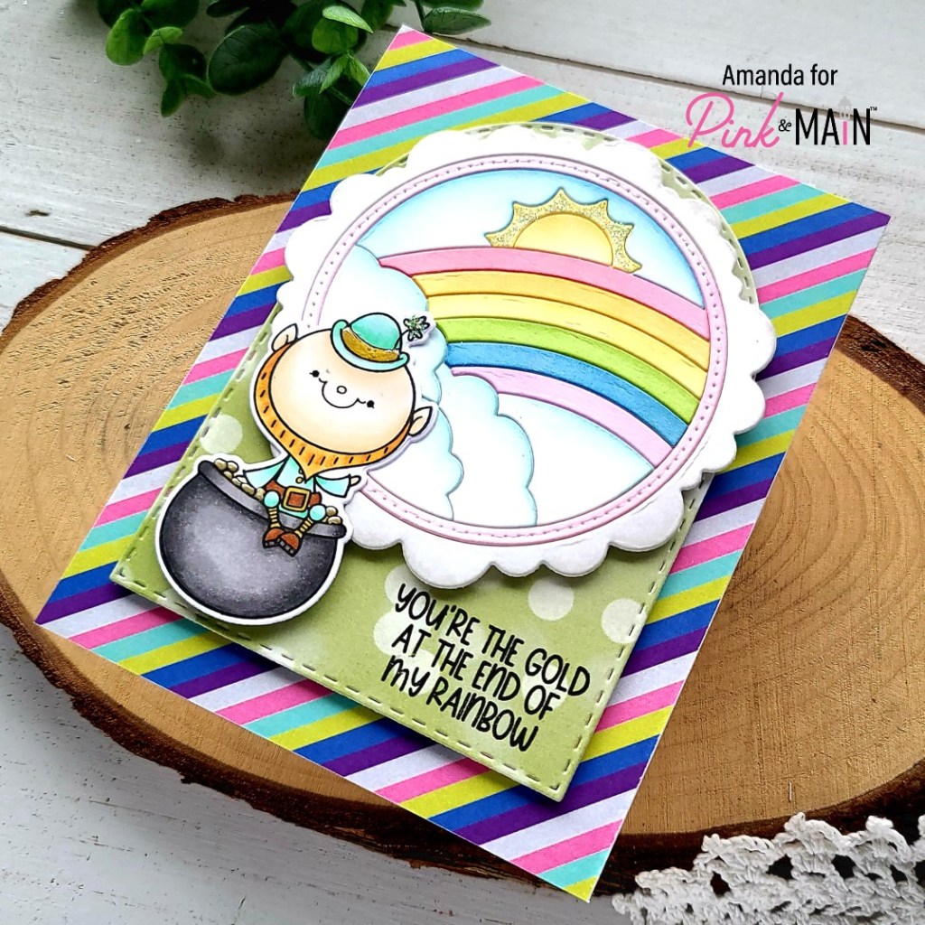 Next, I chose 2 patterned papers from the Butterfly Kisses pad. I cut the stripes to A2 size and adhered it to a white card base. Then I cut the bokeh green piece with a Stitched Arches die. Using the rainbow and leprechaun as guides, I stamped my sentiment on the arch and then popped it up with foam tape on the stripes.