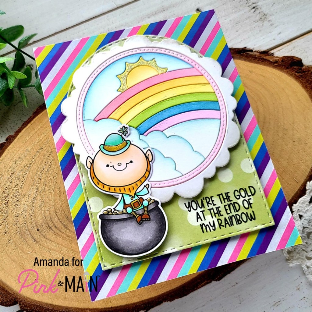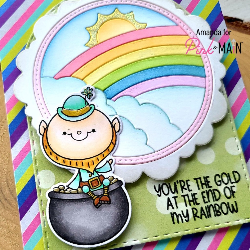 For this card, I die cut the main image from Rainbow Friend and then used my blending brushes and dye inks to ink up the various pieces. Then I used the Layered Circles dies to cut a circle just smaller than the scallop edge so I could adhere all the pieces together. Once that was complete I decided on this cute leprechaun and his pot of gold from Lucky Leprechaun. I stamped and colored him with copic markers before using the coordinating dies to cut him out.