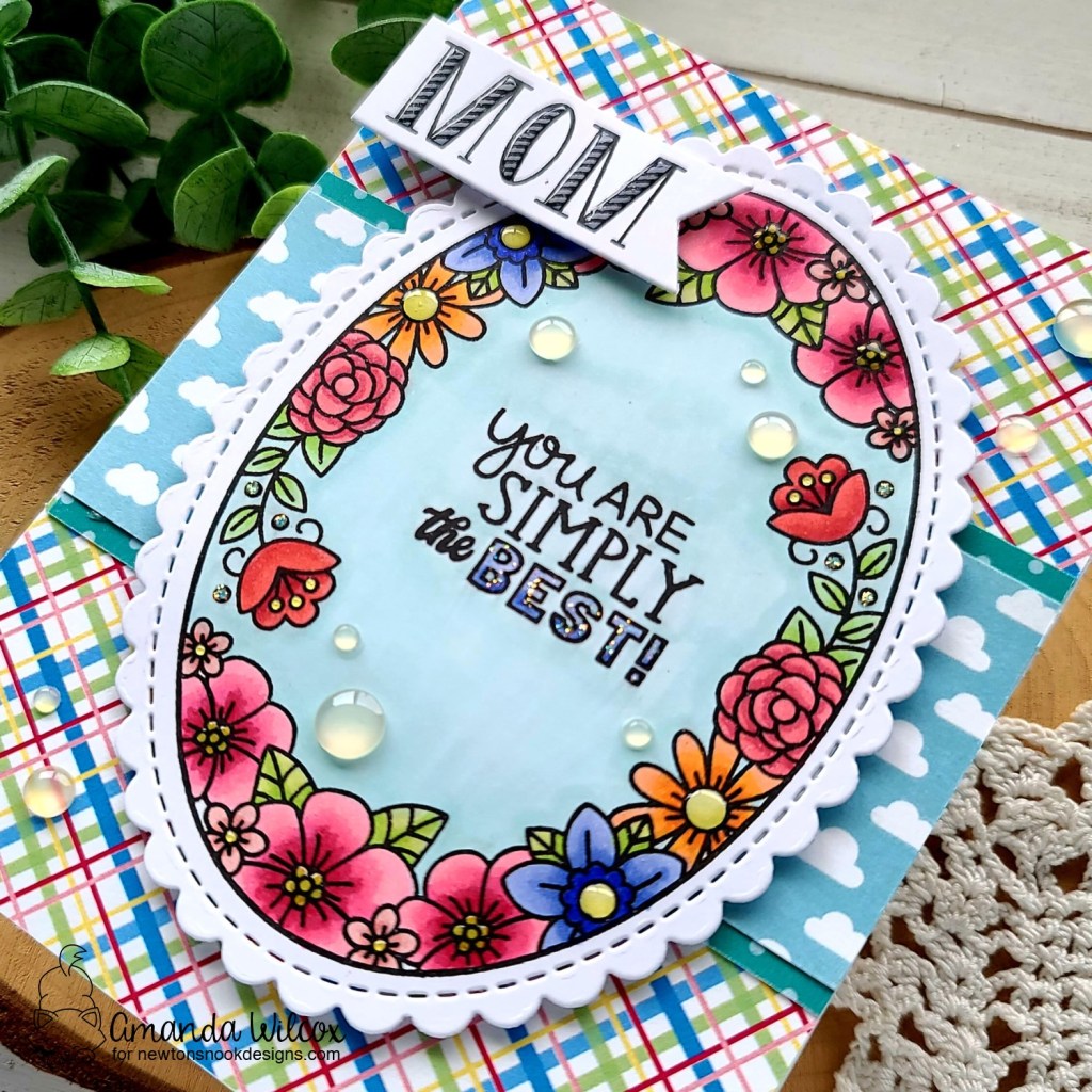 I trimmed the plaid paper to A2 size and adhered it to a white card base. Then I cut a strip of the fun cloud paper and edged it with the teal polka dot print before adhering it next. Then I popped the oval up with foam tape. To round out the design I thought it would be fun to add the “MOM” to a banner and pop it up too. This banner came from the Frames & Flags die set.