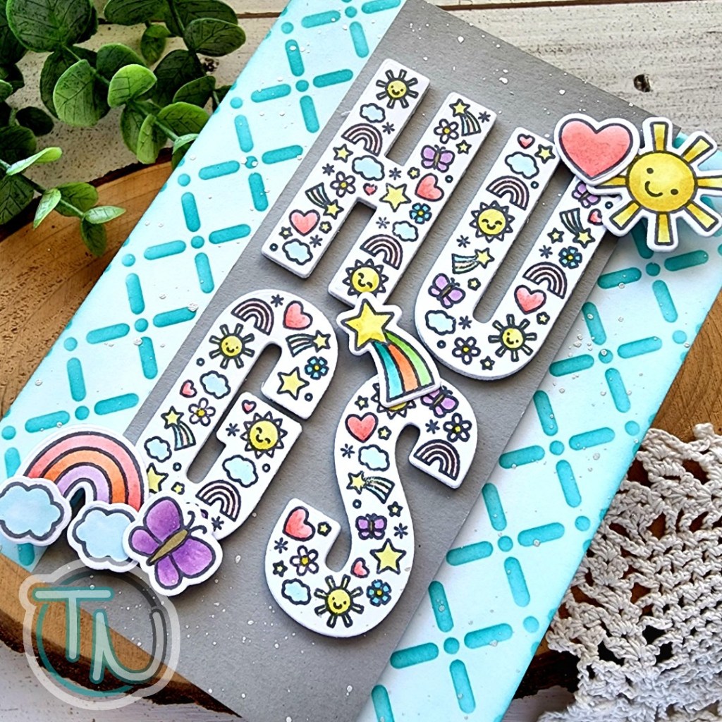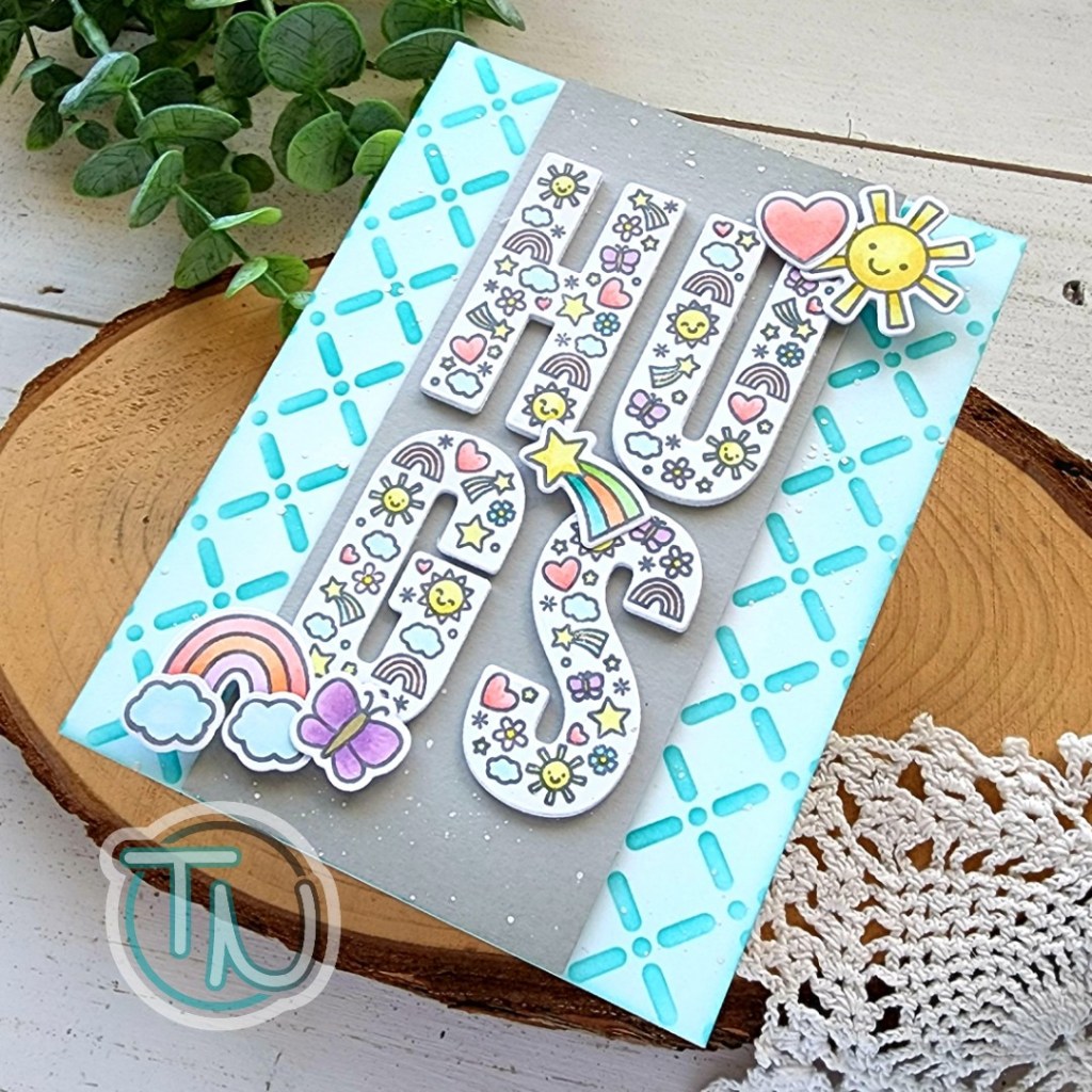 Today I stamped the main “hugs” sentiment and some supporting images in gray ink for a softer look. I used copic markers to color everything and then the coordinating dies to cut it all out. Then, for fun I played around with the letters and decided to try arranging them in a grid instead of a line. I think this is a fun, different look.