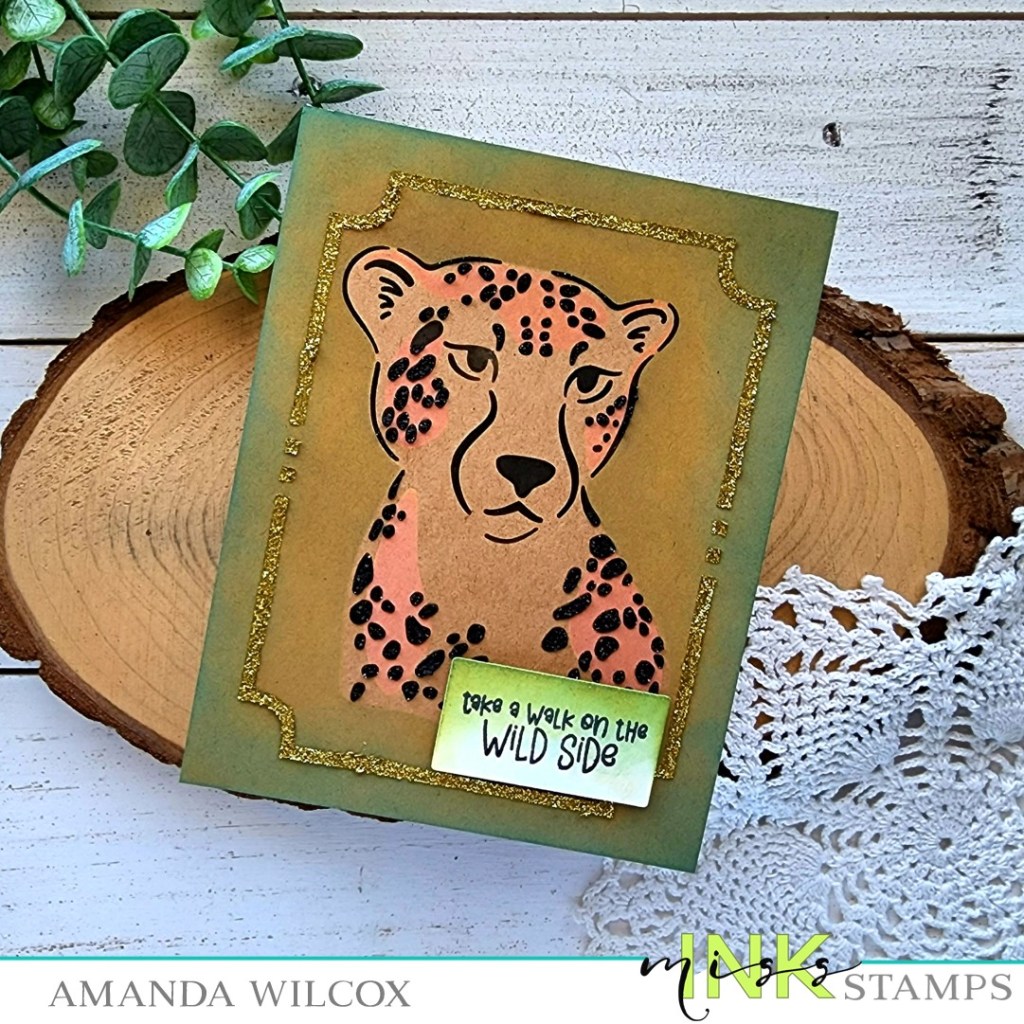 Today I started with kraft cardstock and used the mask to ink around the cheetah with peeled paint distress oxide ink, then I inked the edges of the panel with rustic wilderness distress oxide for a color gradient.