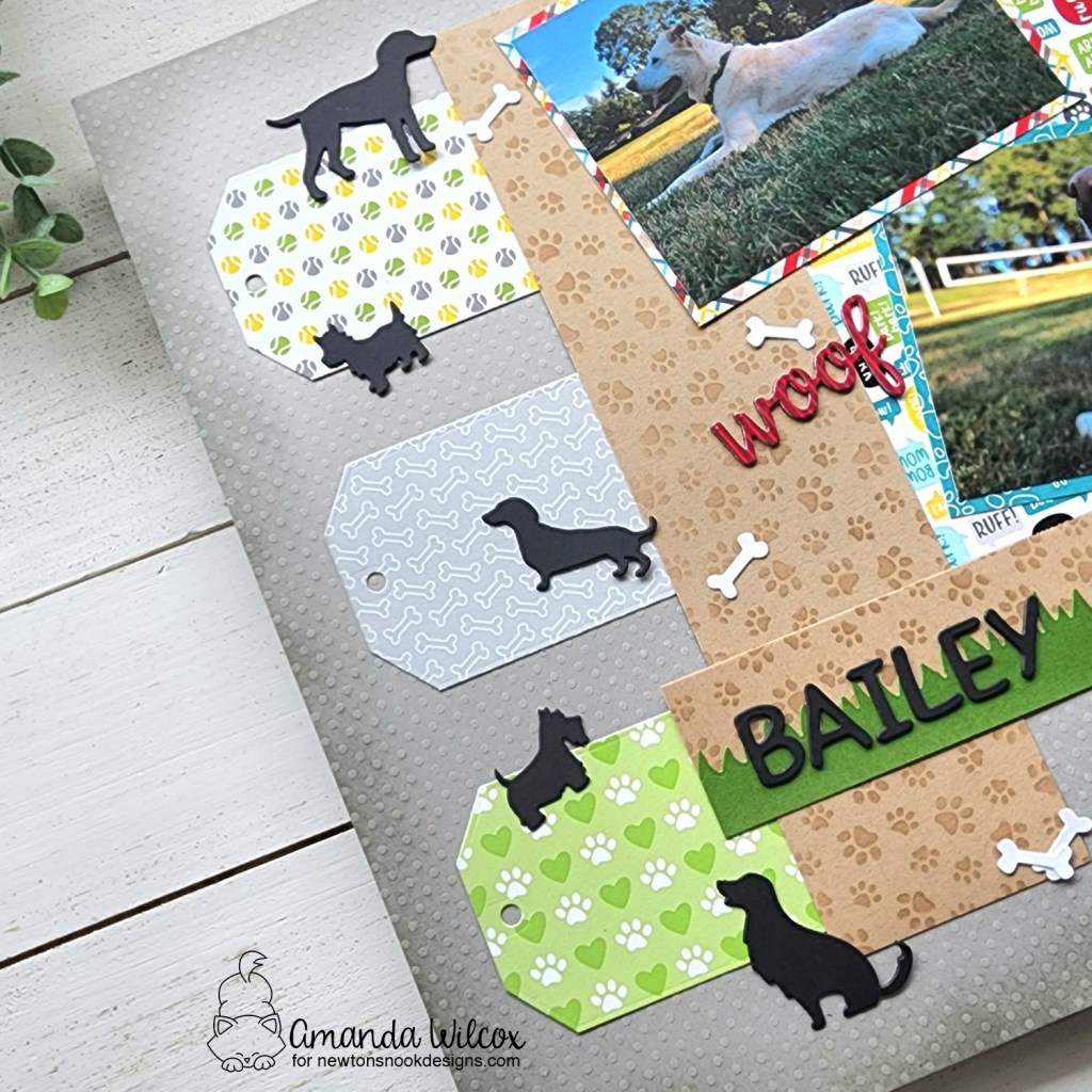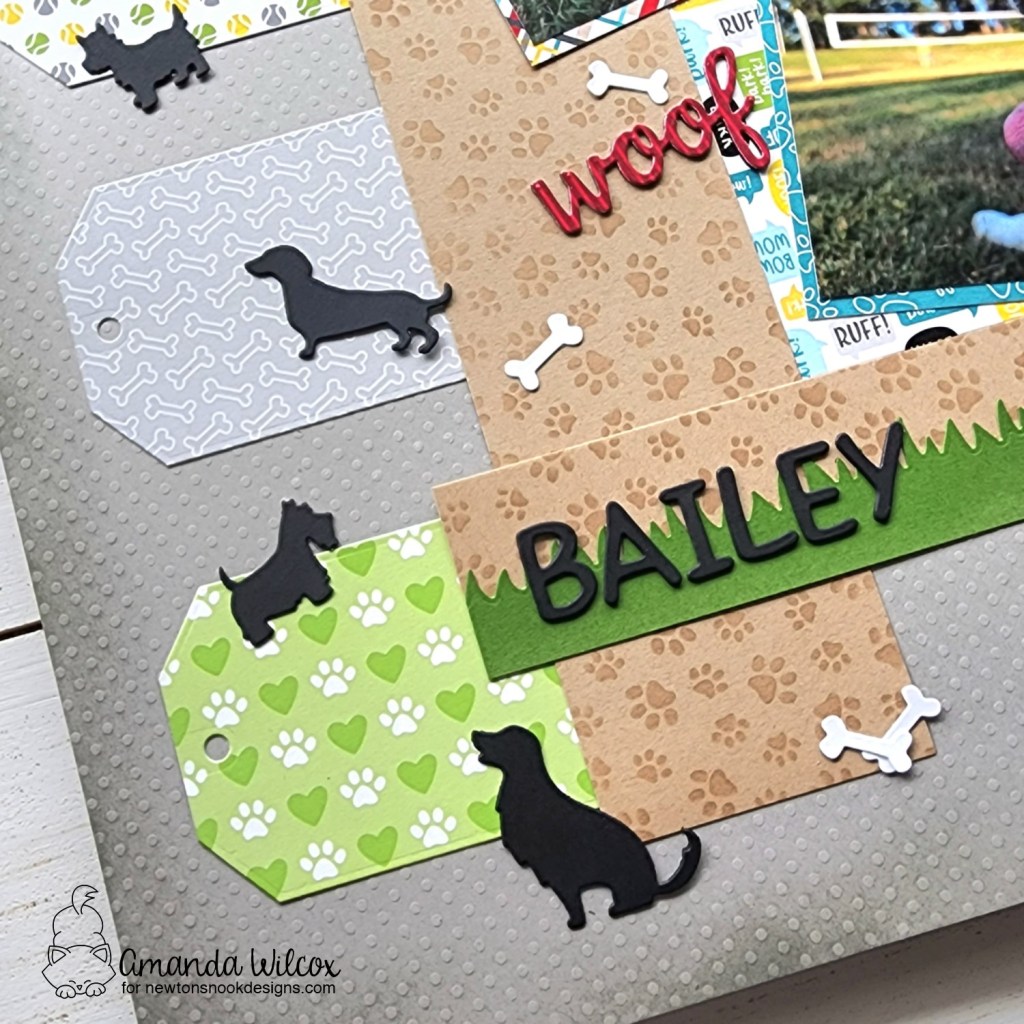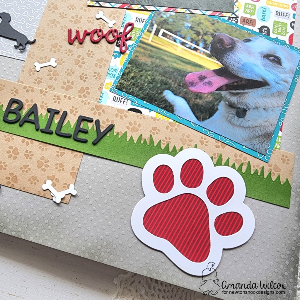 I pulled out the paw shaker die set and used it for a few elements – the large paw here, those fun little bones and the woof die cut too. I used the essential alphabet dies to cut his name from black cardstock and added it to the grass border.