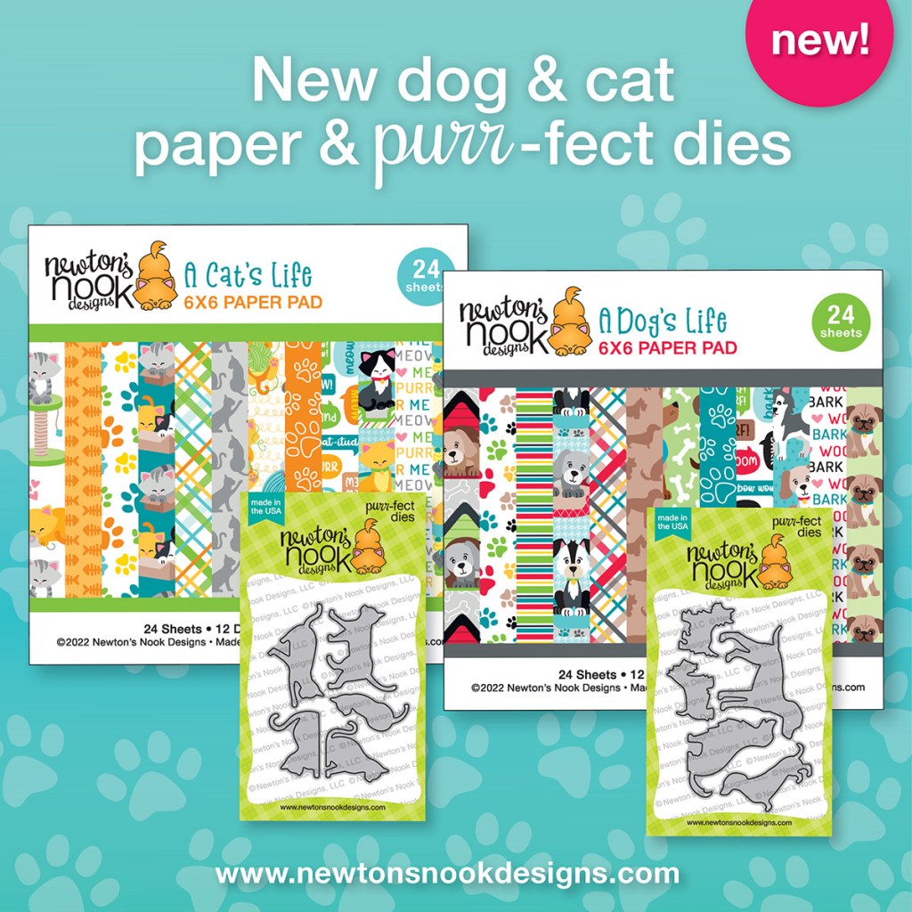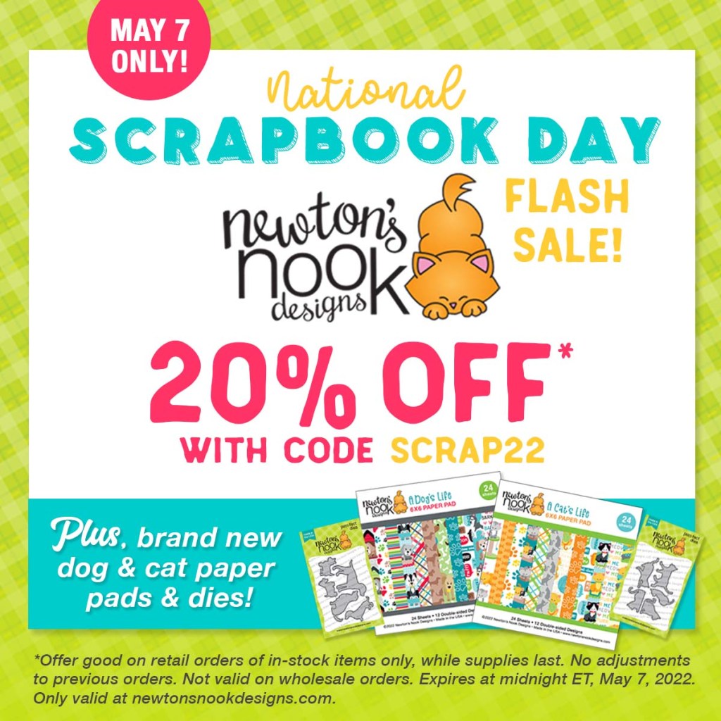 Happy National Scrapbook Day! Today Newton’s Nook Designs is celebrating with NEW dog and cat themed papers and dies! These new products are available NOW in their shop! Plus, there is a FLASH SALE TODAY! Save 20% off today only with code SCRAP22 at newtonsnookdesigns.com.