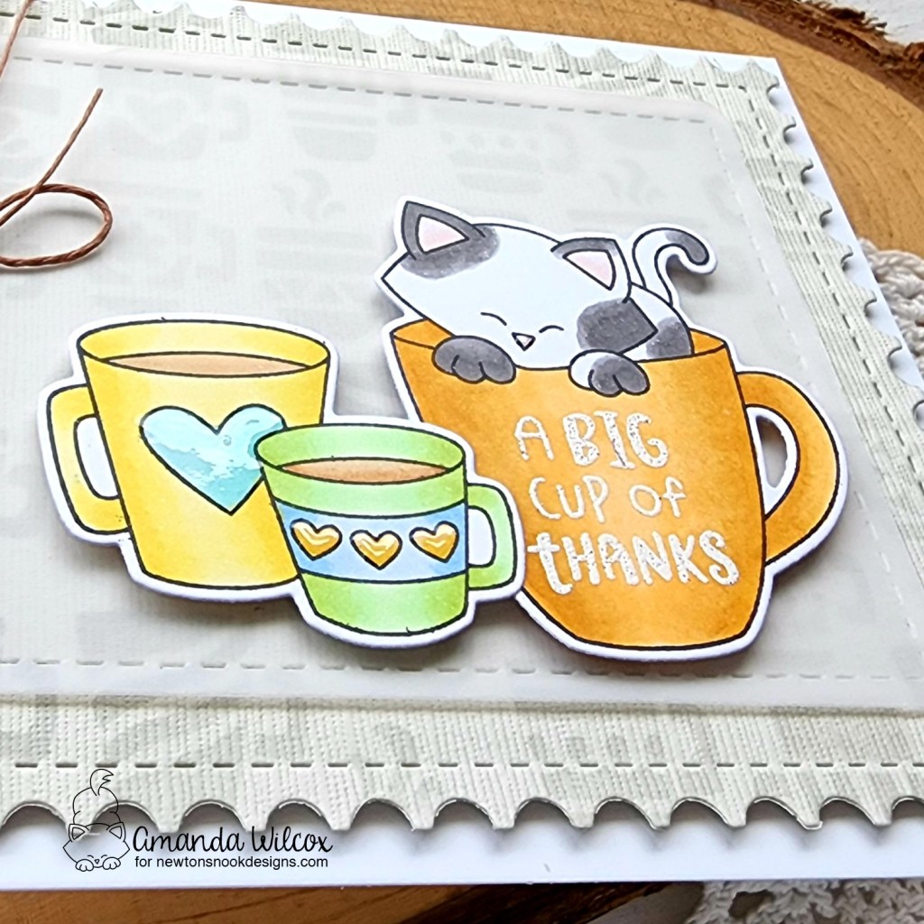 I started by stamping the main image from Newton’s Mug and the pair of cups from Love Cafe and colored them with my copic markers. I used the coordinating dies to cut them out and then kept going back and forth between adding the sentiment to my large mug or decorating it with lines and dots. Obviously, I landed on the sentiment but either way would have been awesome!