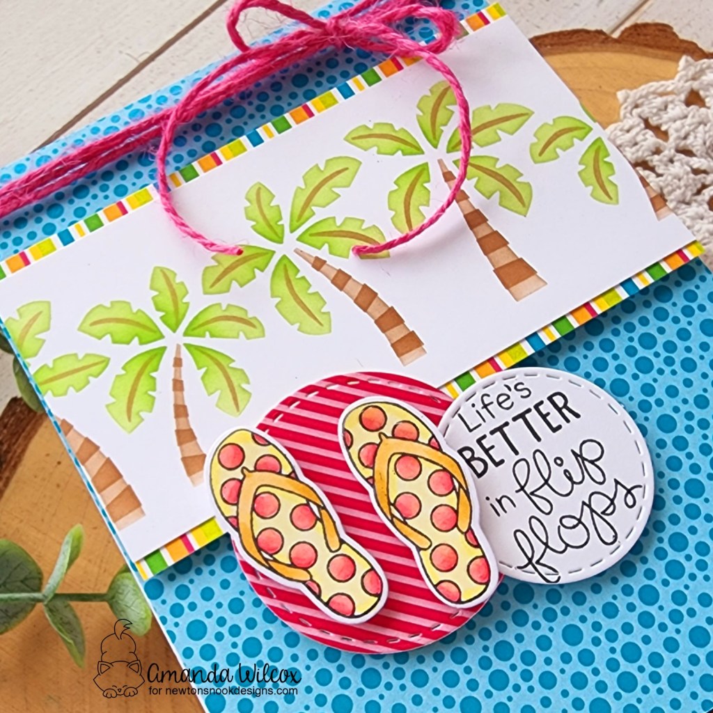 These are great designs, and I love the extra touches – paper strips, flip flops, stamped images as background!
