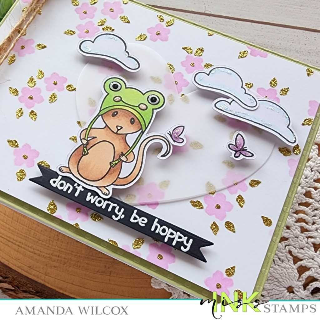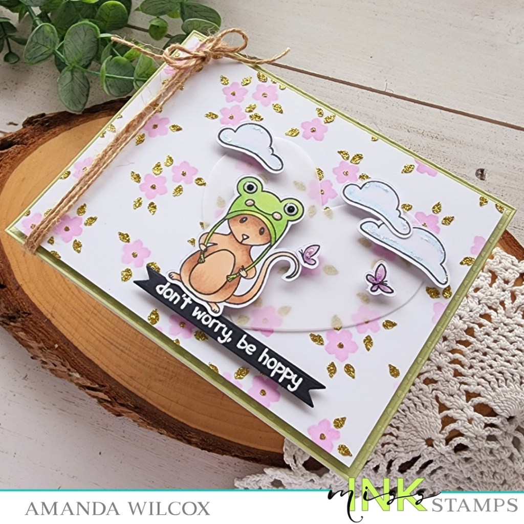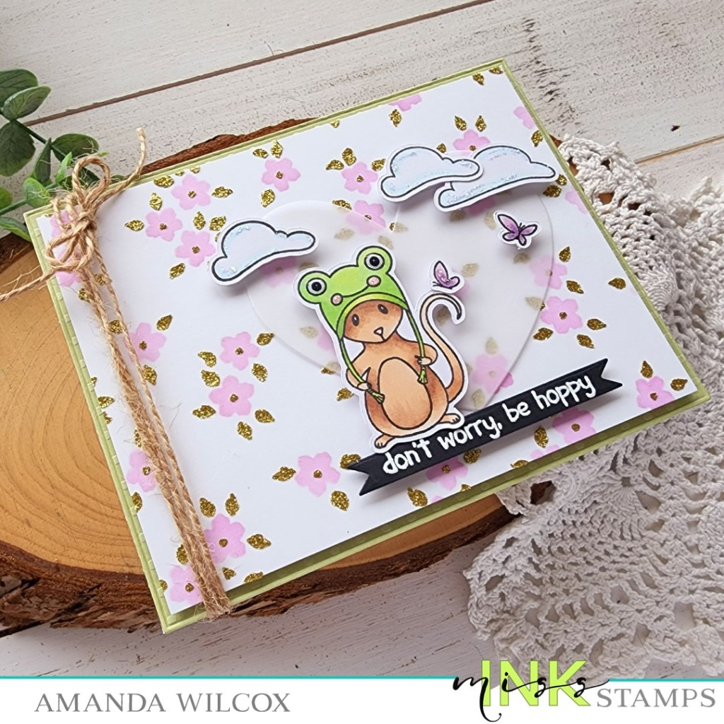 For finishing touches I added glossy accents to the mouse’s nose and frog hat eyes. Then I came in with unicorn Stickles on the hat cheeks, butterflies and clouds. Last, I added some twine tied in a bow on the left side of the card. I like this more natural texture paired with the flashy glitz gel. I feel like they balance each other out in a really cool way.