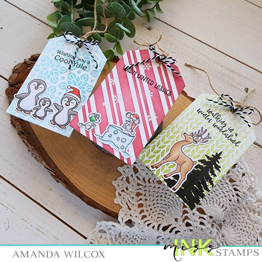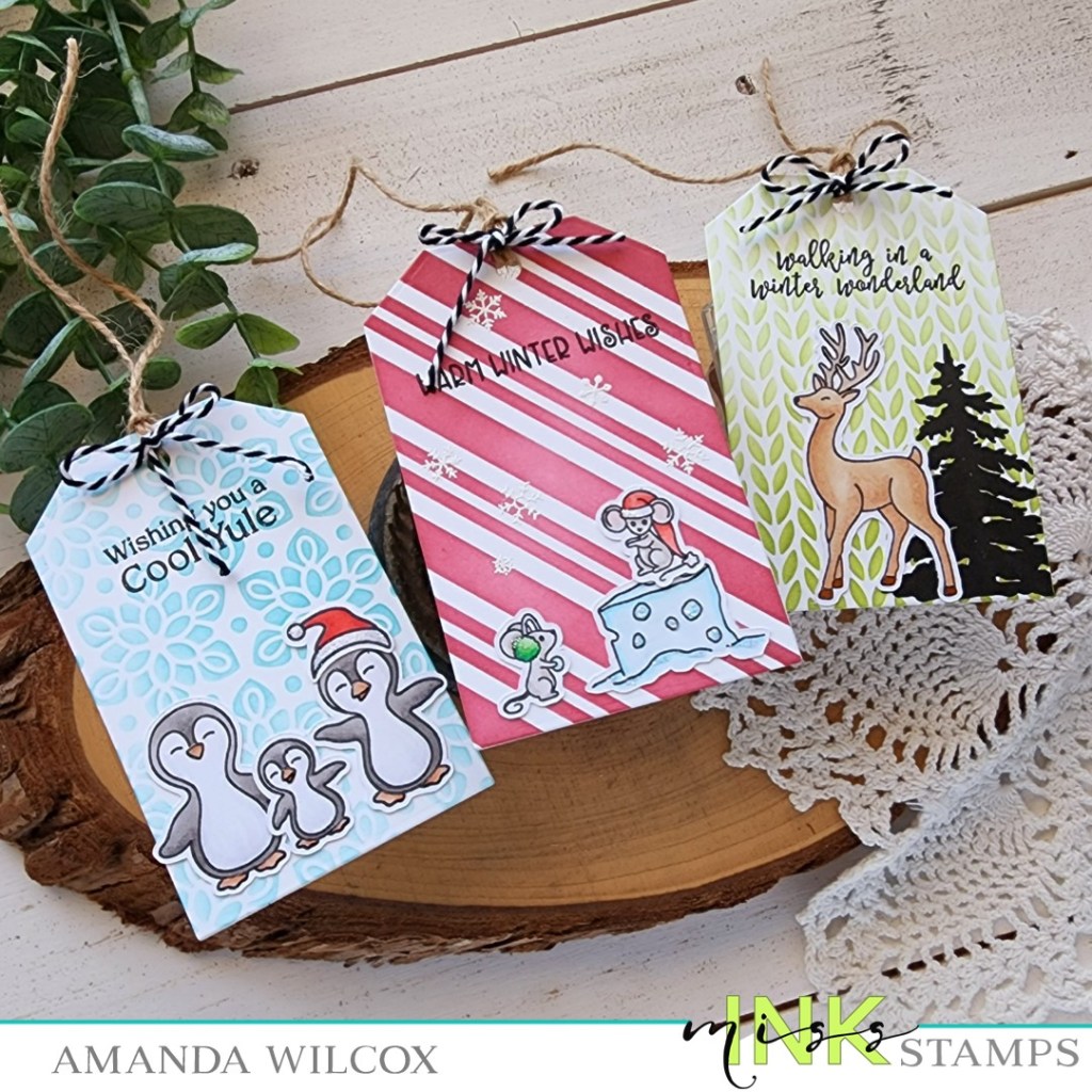 Hey everyone! Thanks for stopping by again today. For this week’s regularly scheduled Miss Ink Stamps inspiration, I decided to play a little Christmas in July and make a set of tags to get a jump on things.